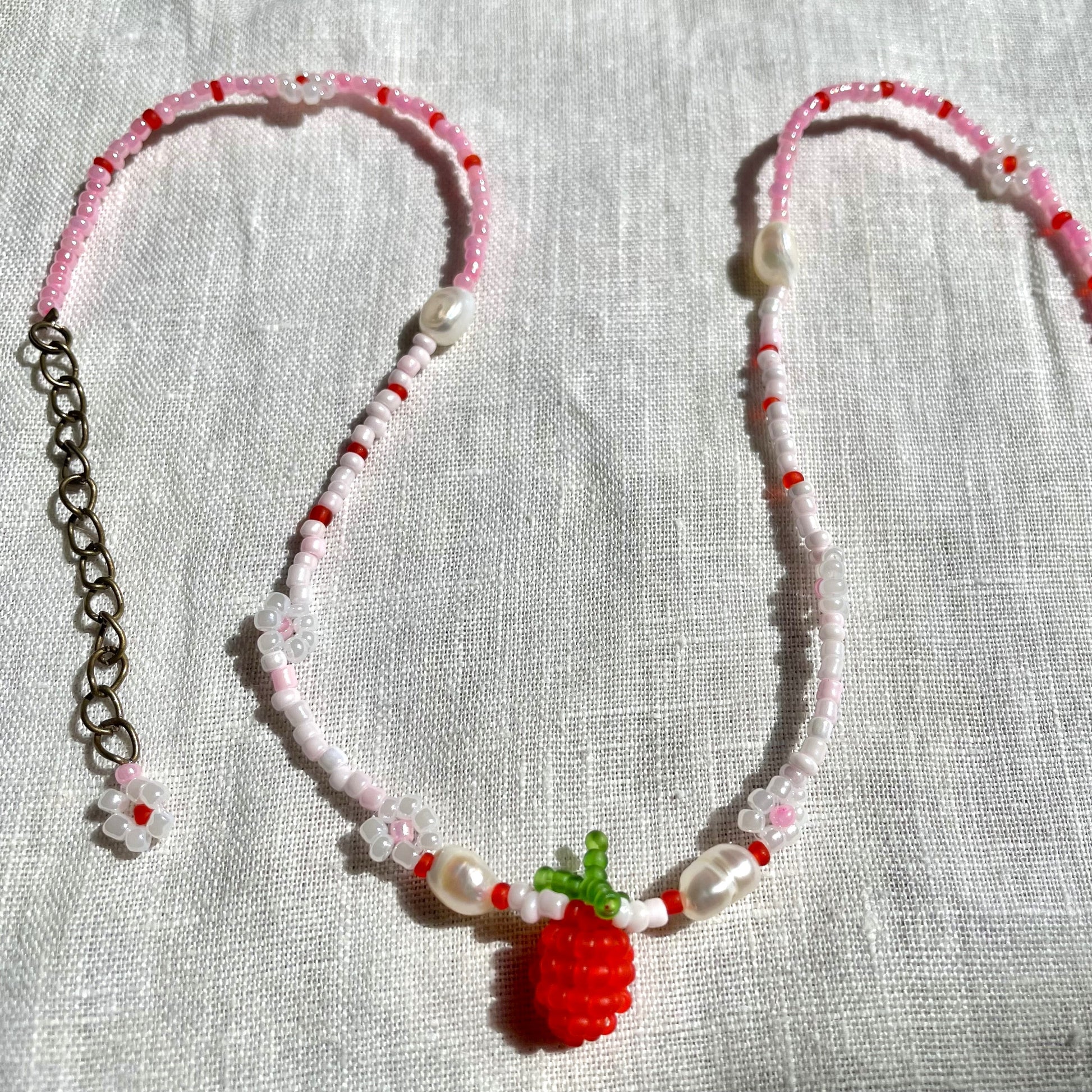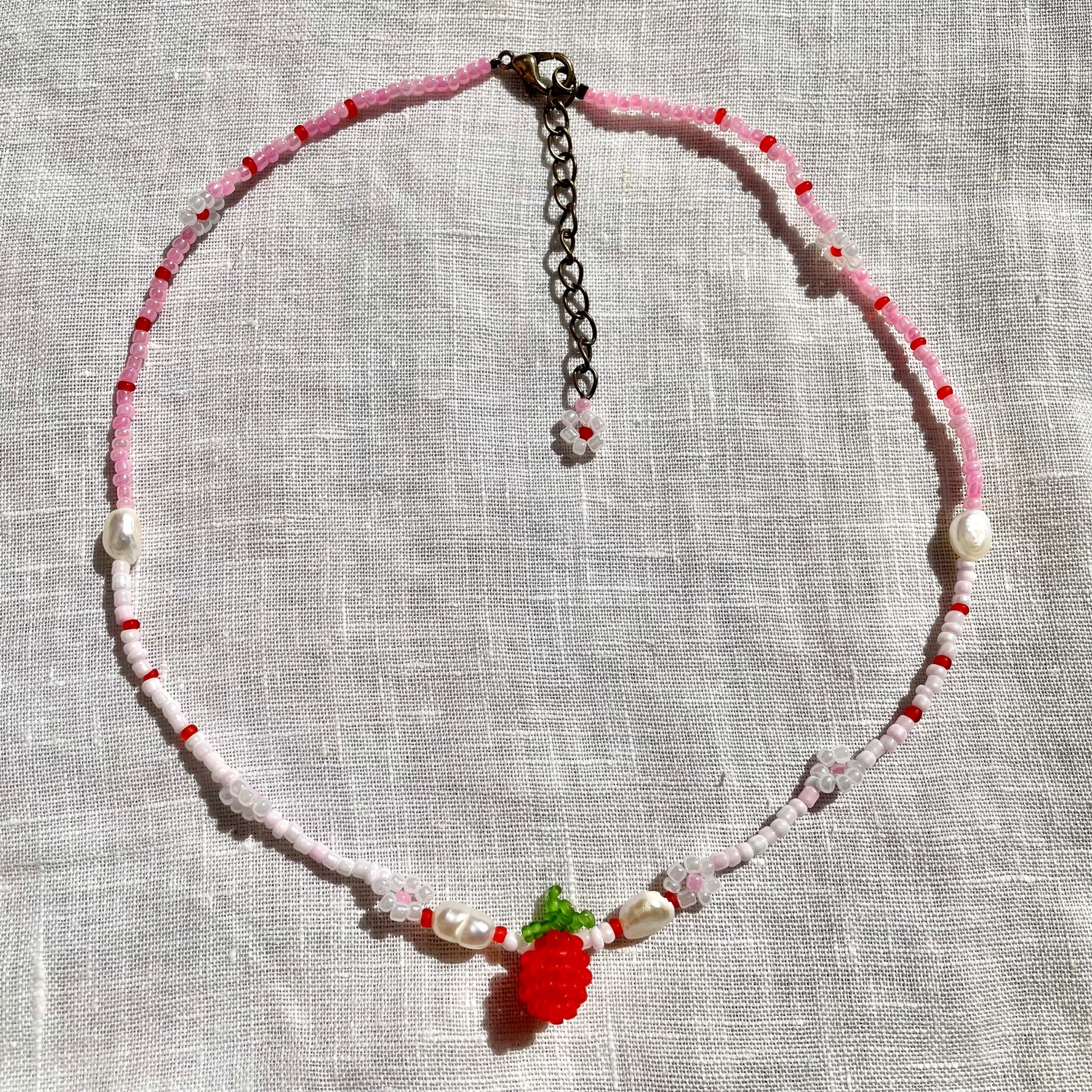 Ett handgjort pärlhalsband med rosa toning, dekorerat med en jordgubbe och sötvattenspärlor, skapat med kärlek och omsorg. Inspirerat av sommarens jordgubbsvibbar för att ge varma känslor och glada minnen.