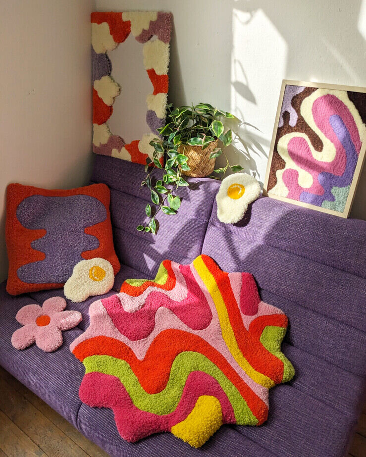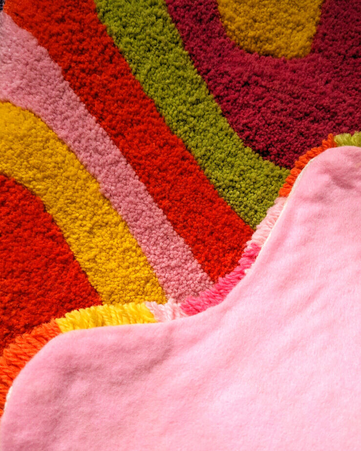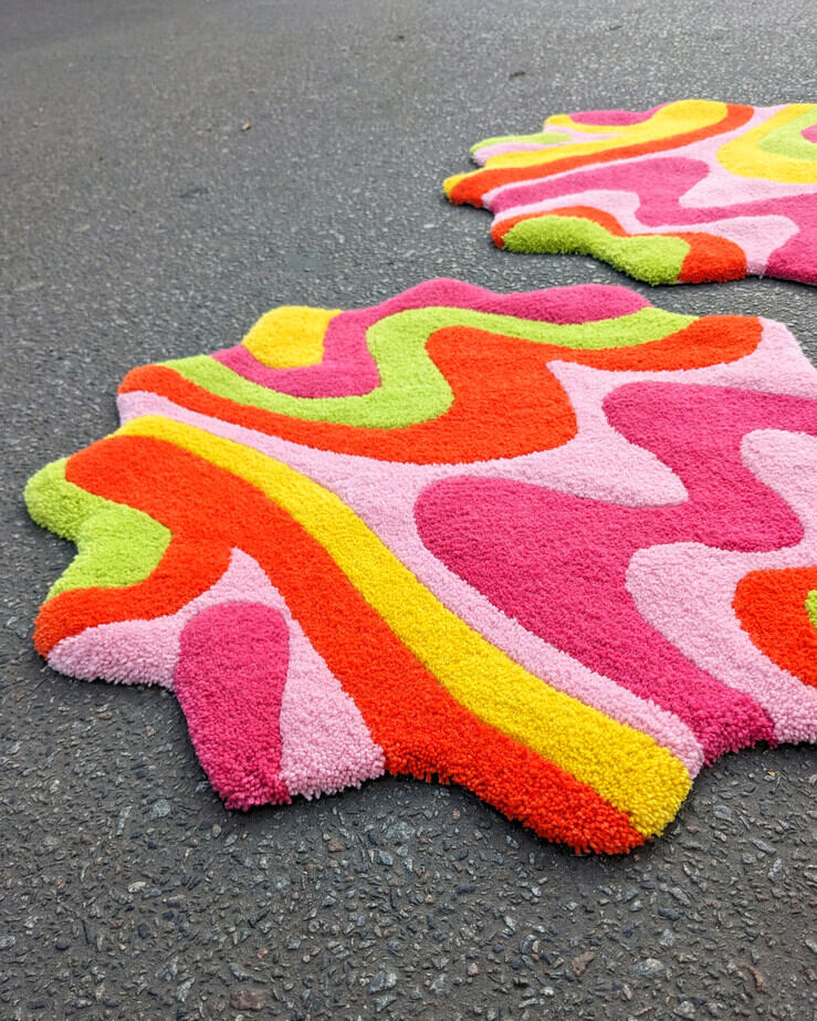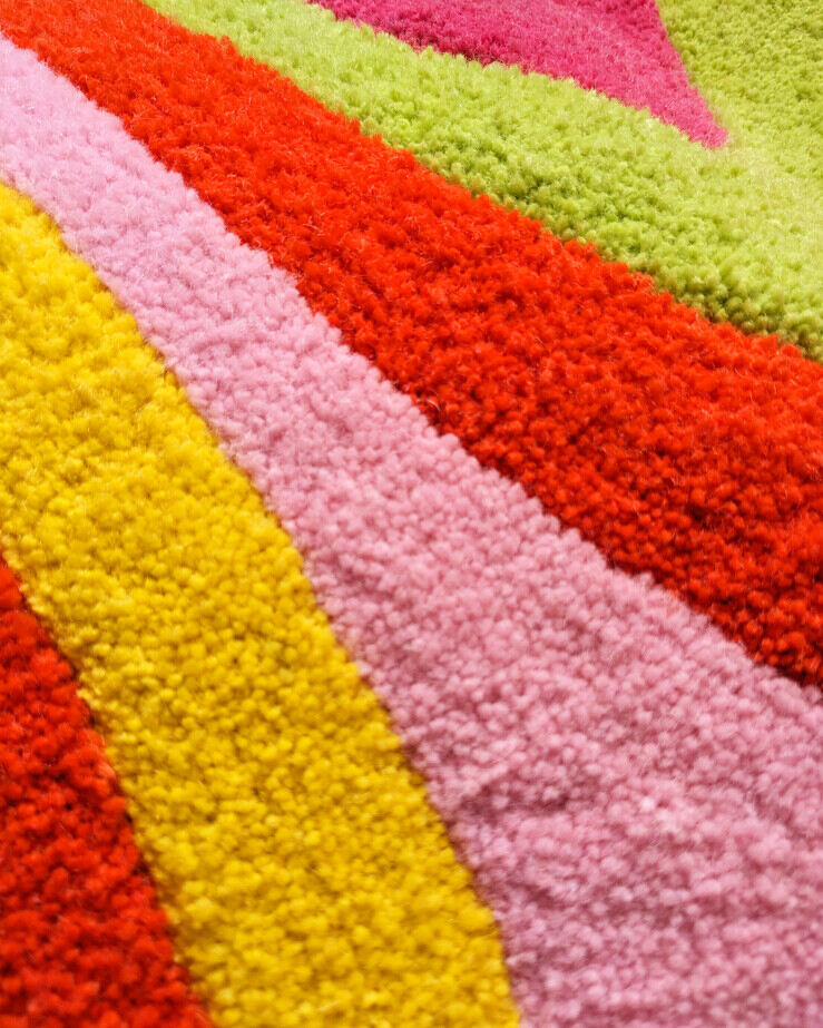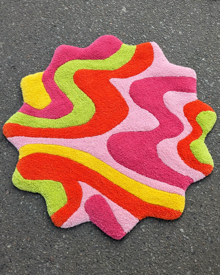 Denna retro vågiga ullmatta är handgjord och designad i Berlin, Tyskland av Zeyu. Hon skapade detta fluffiga verk, som har livfulla färger, flödande vågor och flytande former, som en hyllning till 1970-talets psykedeliska konst. Skötsel: Använd en dammsugare för att rengöra. Vid behov, rengör försiktigt i en cirkulär rörelse. Ej lämplig för tvättmaskin.