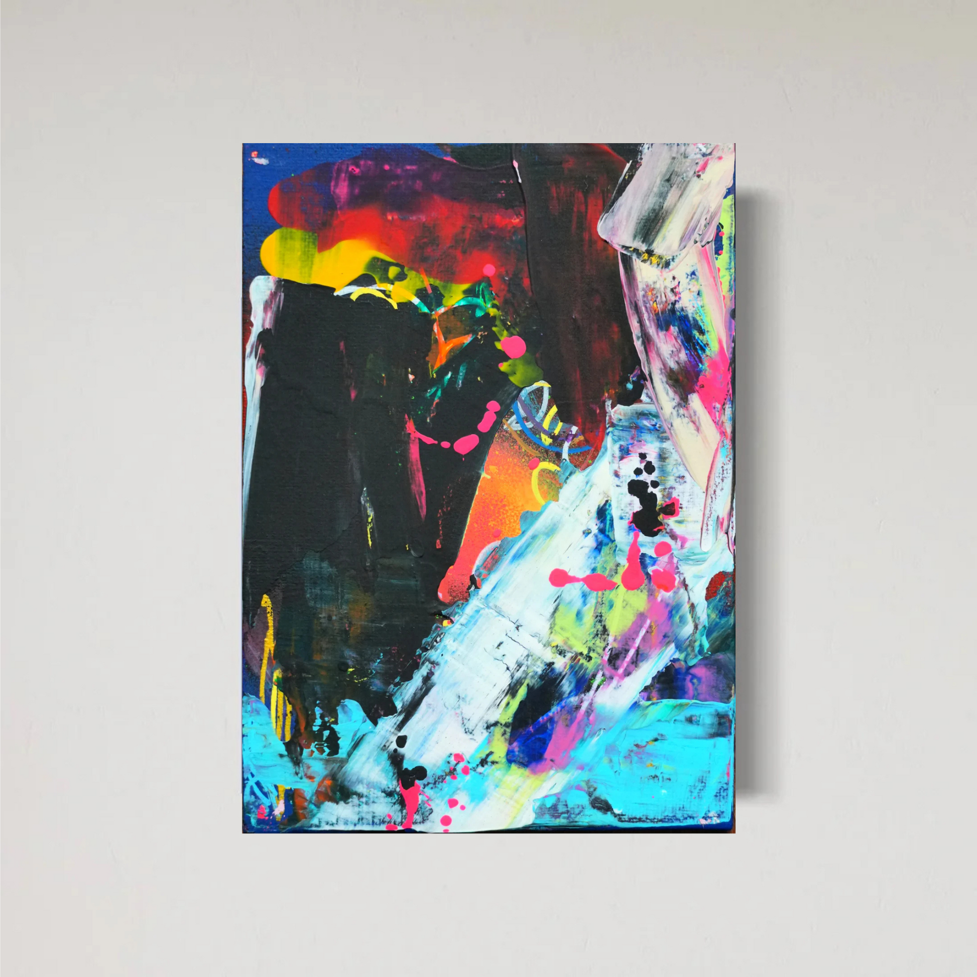 Denna livfulla serie med 5 delar fångar den abstrakta essensen av en solnedgång i rörelse. Explosiva lager av neonrosa, orange, turkos och svart krockar och smälter samman över varje duk och framkallar det avtagande ljuset och den känslomässiga intensiteten i skymningen. Skapade med palettknivar, penseldrag och dynamiska sprayfärgsdroppar pulserar dessa verk med rå energi och lager på lager texturer.