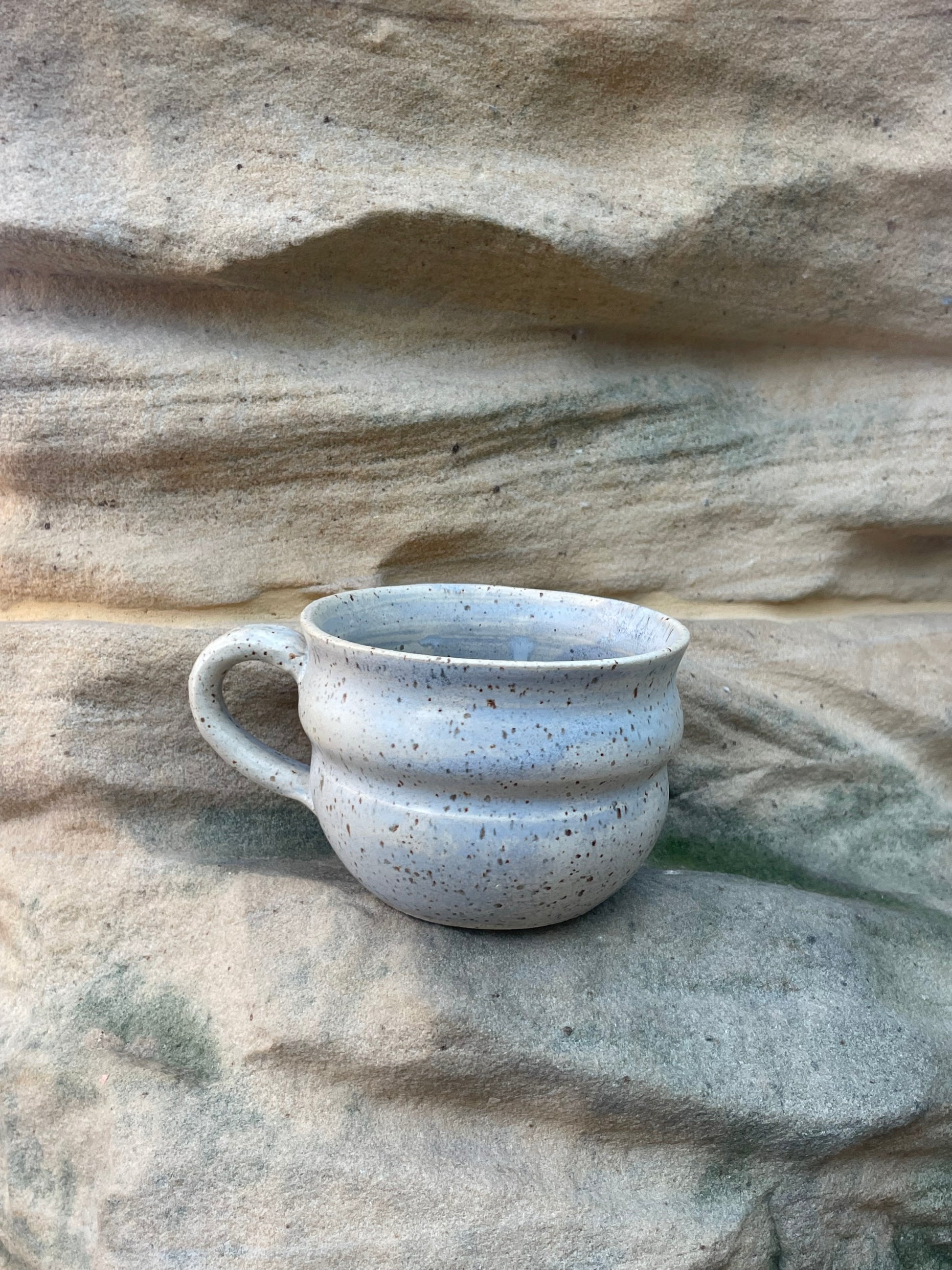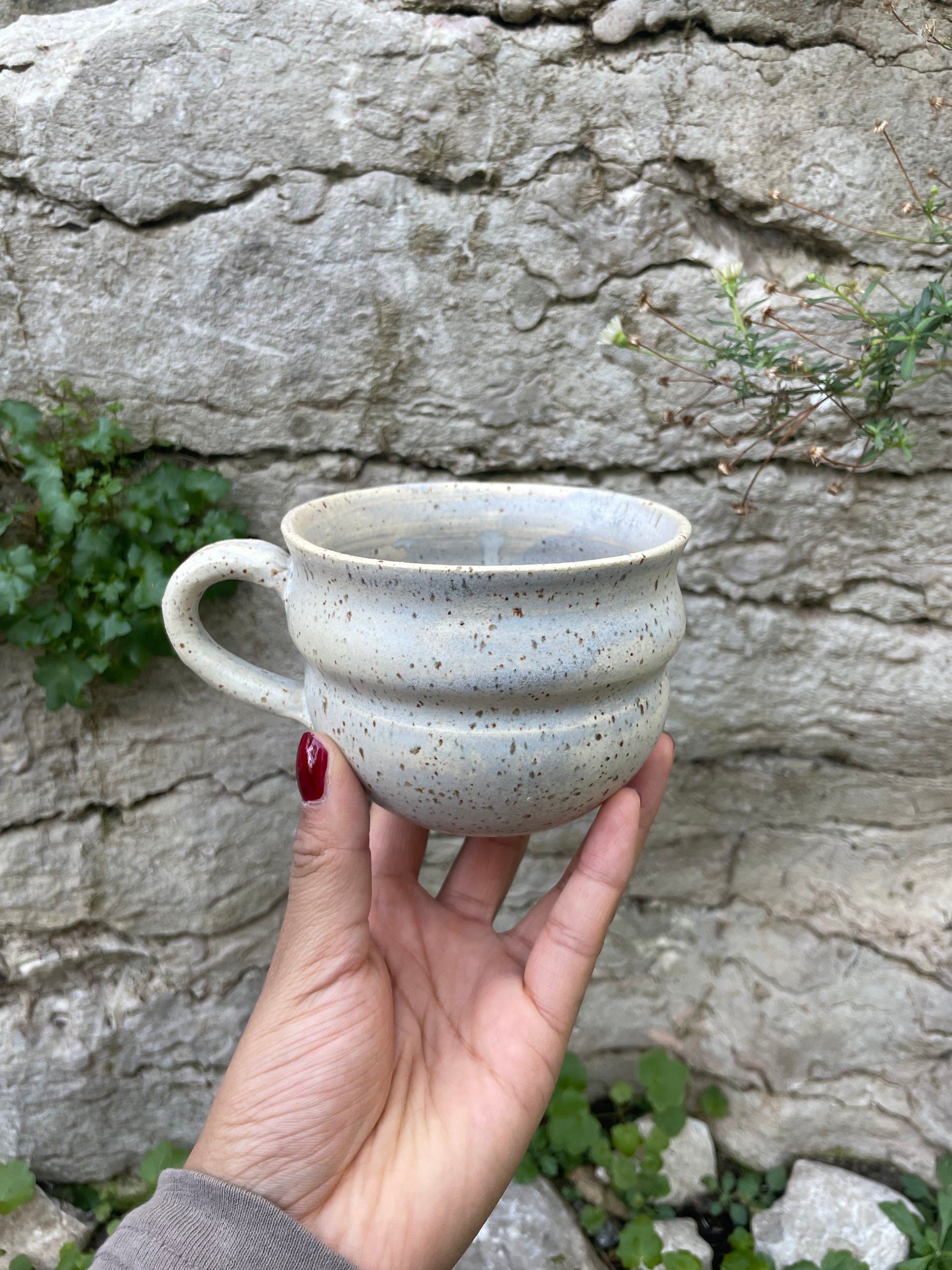 En handgjord tekopp med en lekfull och organisk form. Glasyr inspirerad av naturen.