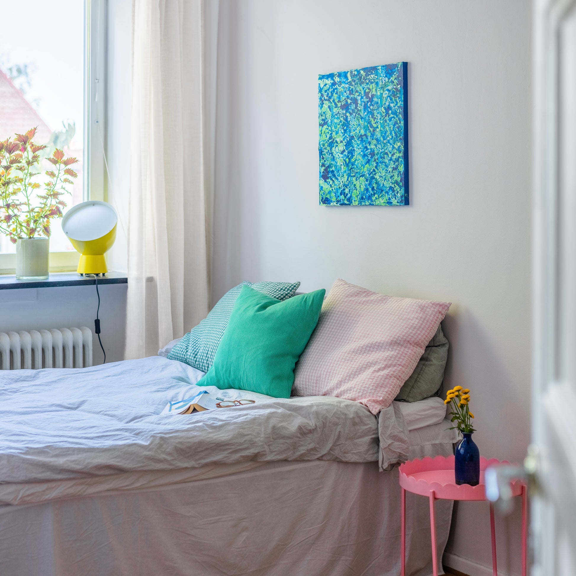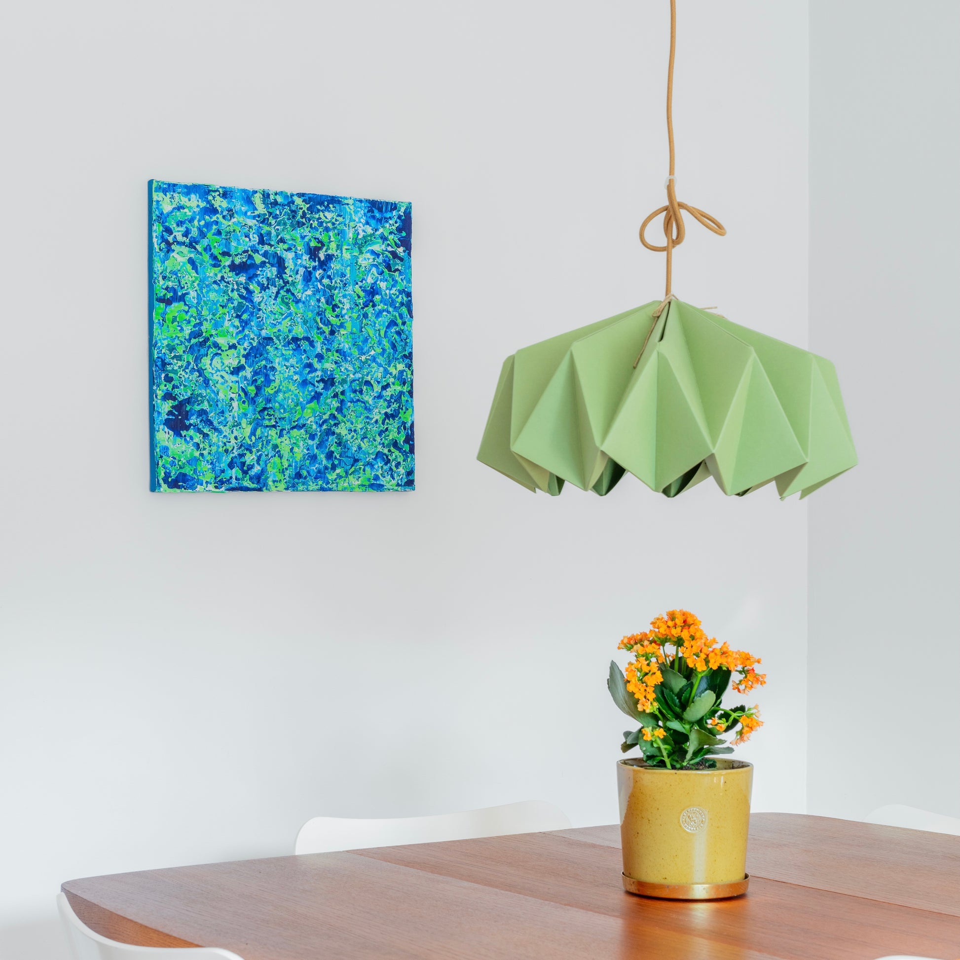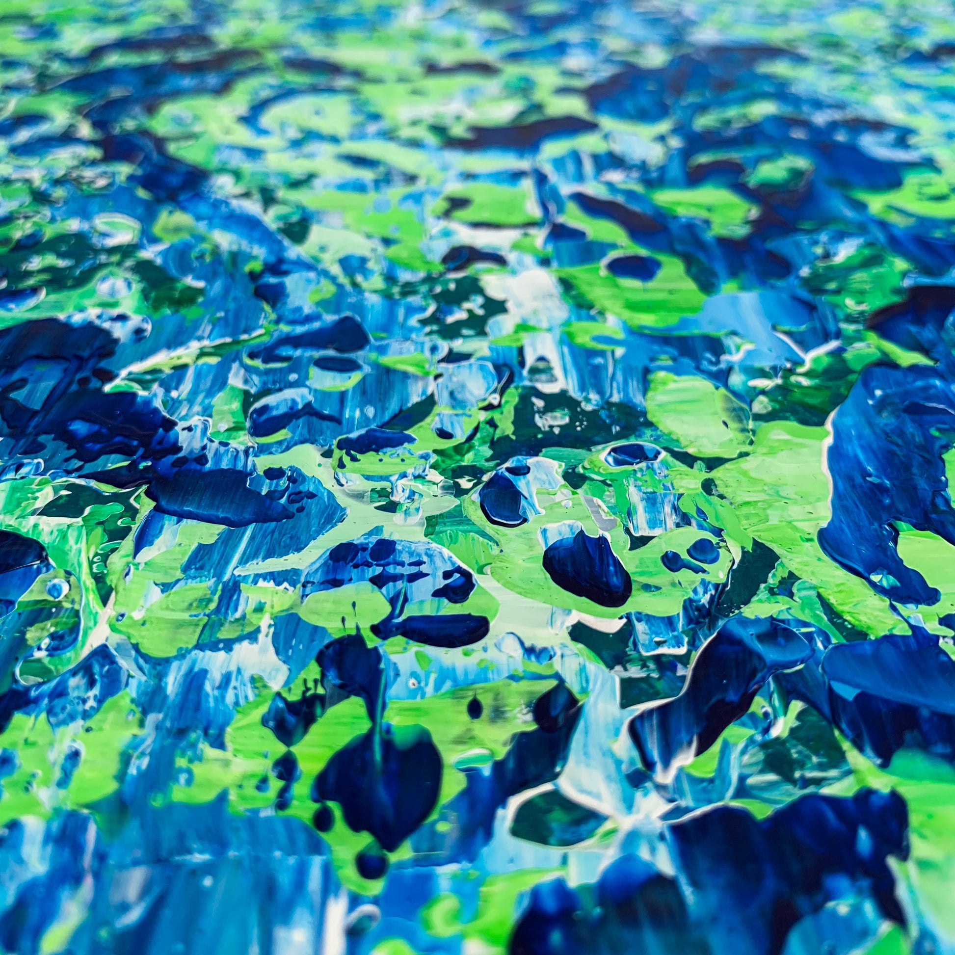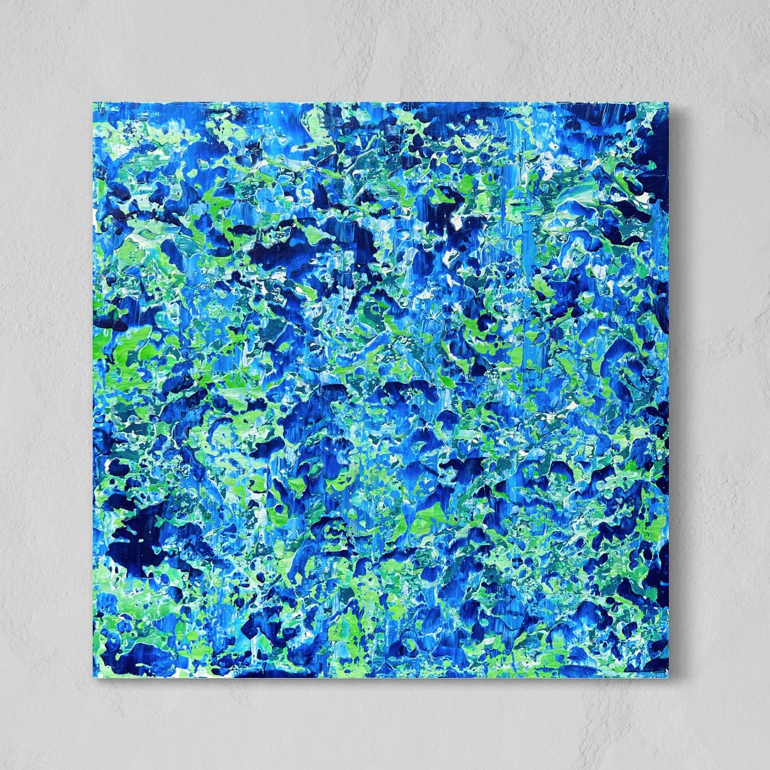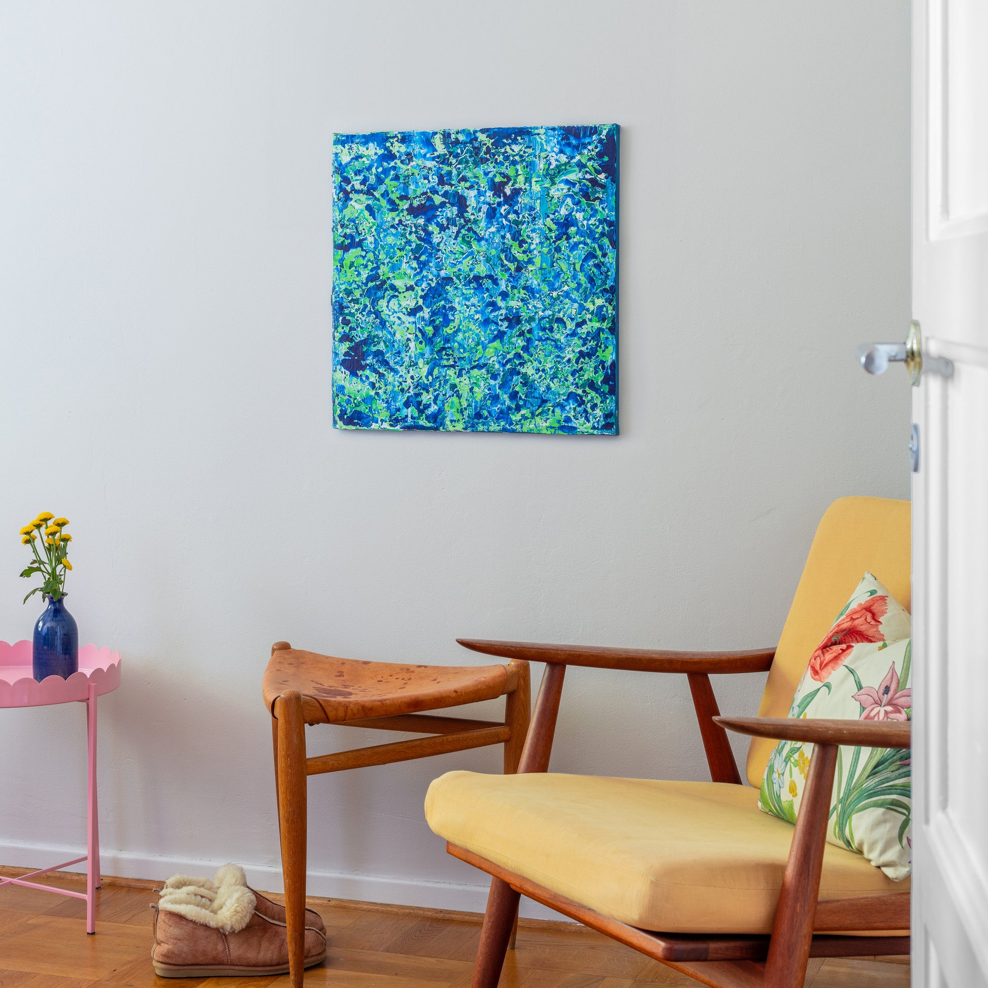 Inspirerad av planeten Jorden speglar Tellus de livliga blåa och gröna nyanserna av vatten och natur. Den abstrakta kompositionen med breda, texturerade penseldrag skapar ett organiskt flöde som för in den lugnande energin från naturen i ditt hem.