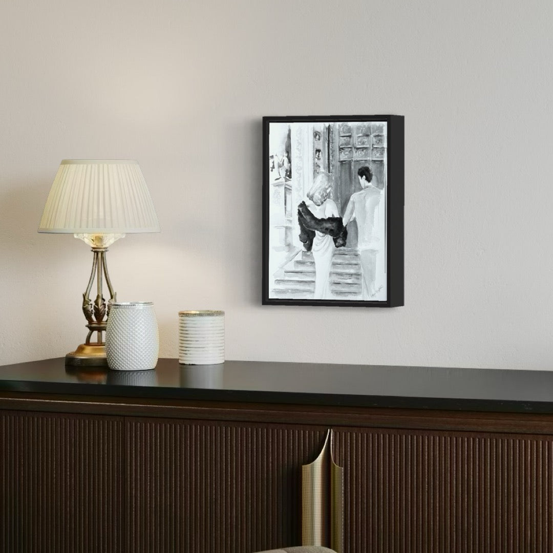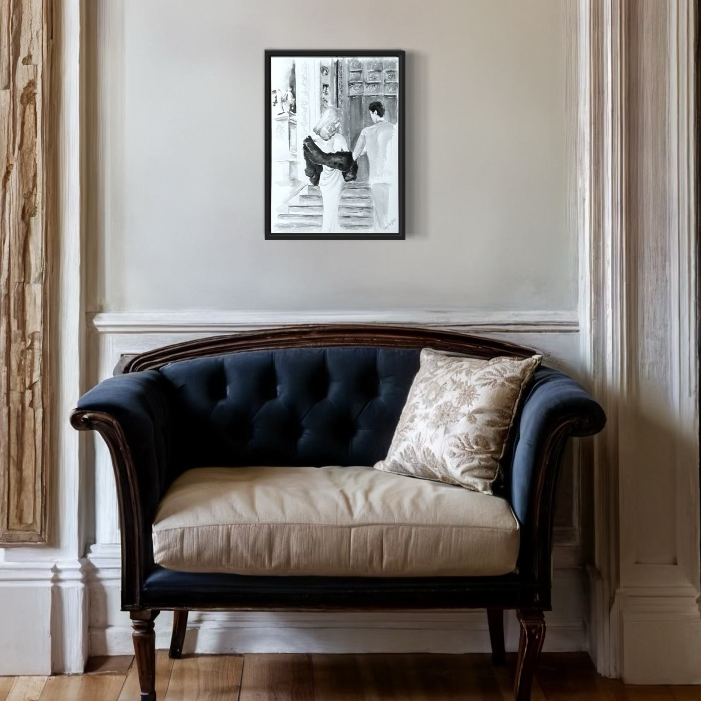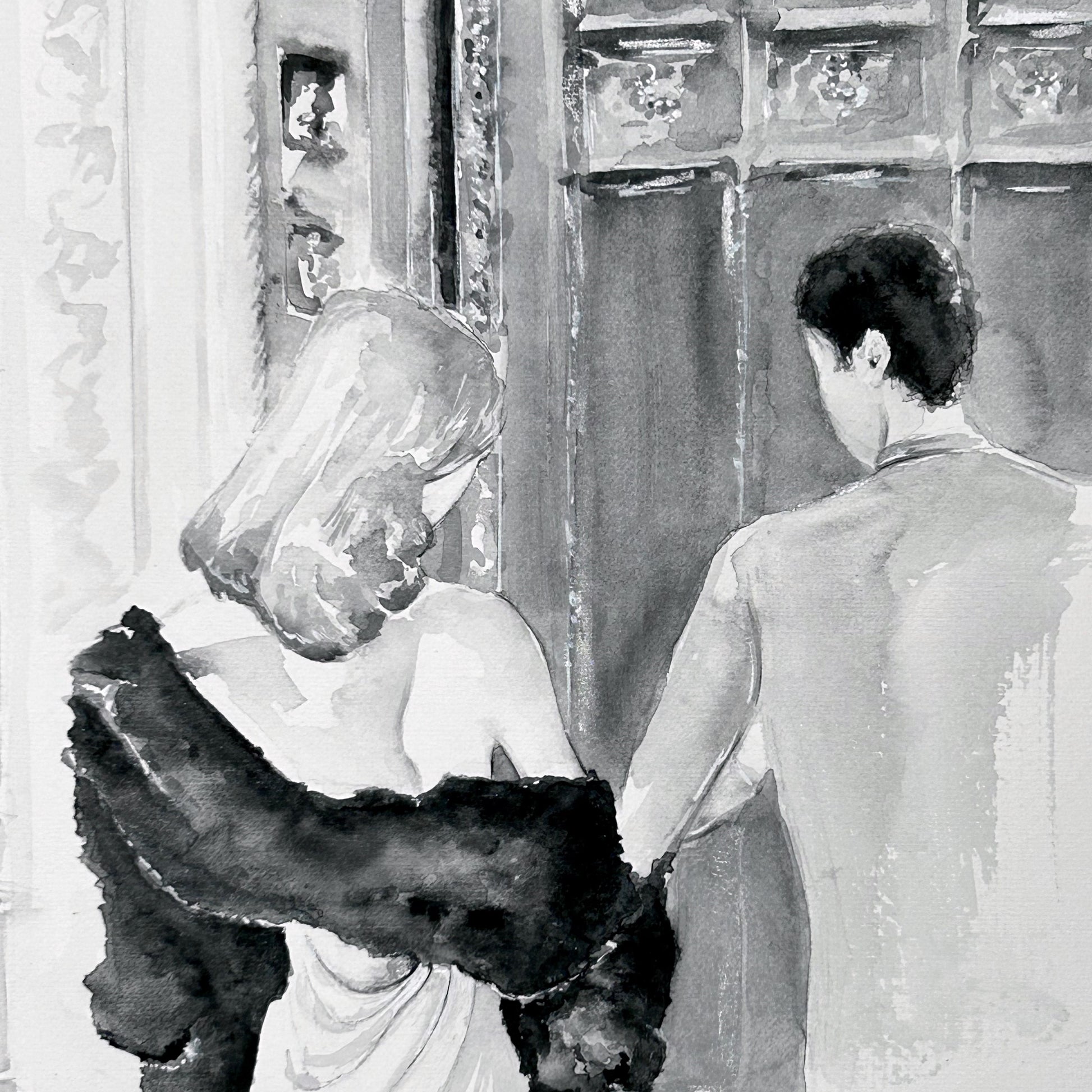The Couple är en akvarellmålning i svartvitt som visar ett par som går arm i arm uppför en trappa mot en byggnad med en stor port. Byggnaden har flera arkitektoniska detaljer, såsom skulpturen uppe till vänster och den stora porten bredvid den. Vilken typ av byggnad det är framgår inte tydligt, vilket lämnar tolkningen öppen för betraktaren.