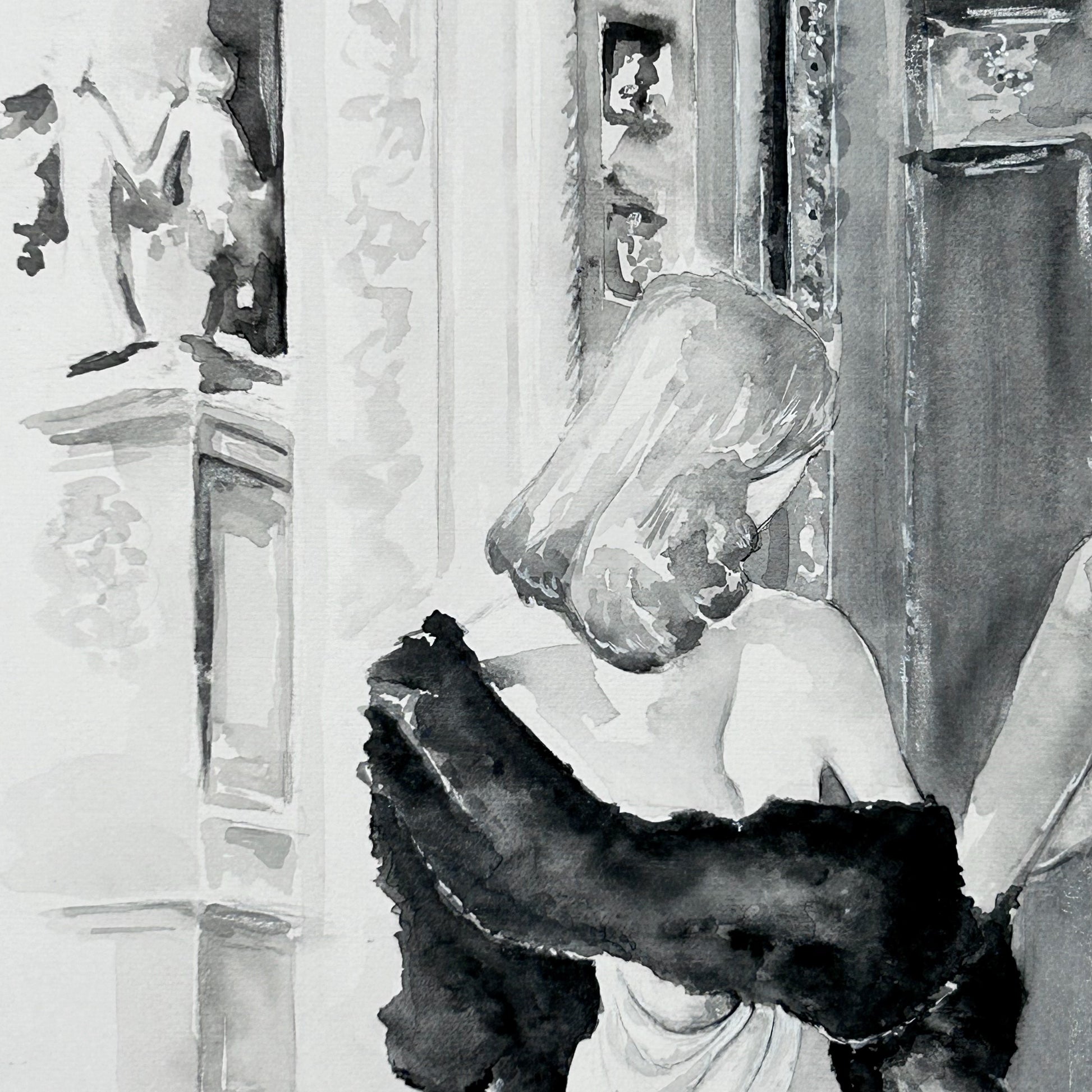 Verket är målat i en mjukare och mer suggestiv stil som låter betraktaren fylla i detaljer och tolka målningen fritt. Lägg märke till de subtila silverskiftningarna på vissa ställen samt de olika akvarelleffekterna som ger verket dess djup och struktur.