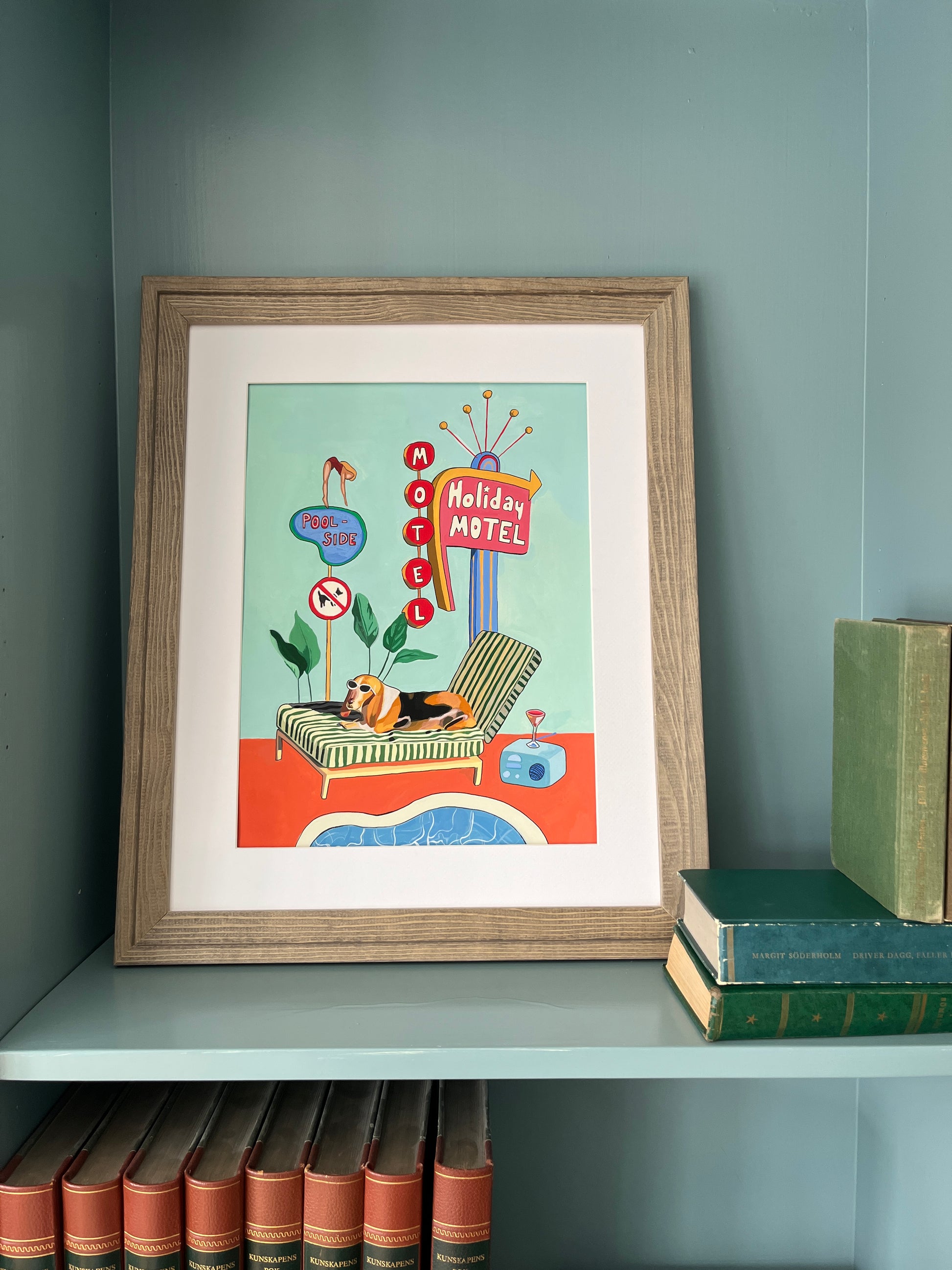 Gör din heminredning roligare och mer färgstark med detta konstverk som heter "The Motel Dog" av Julia Andersen. Den handgjorda målningen föreställer en hund på ett motell och har ett unikt, lekfullt utseende!