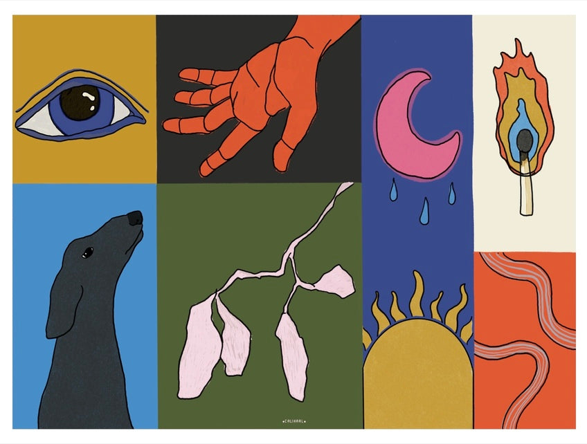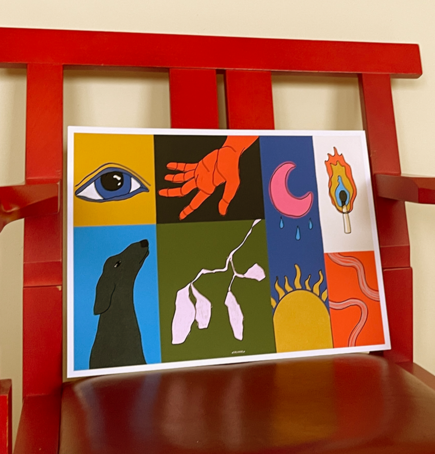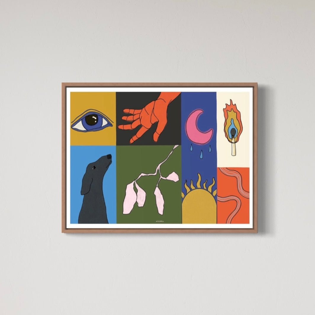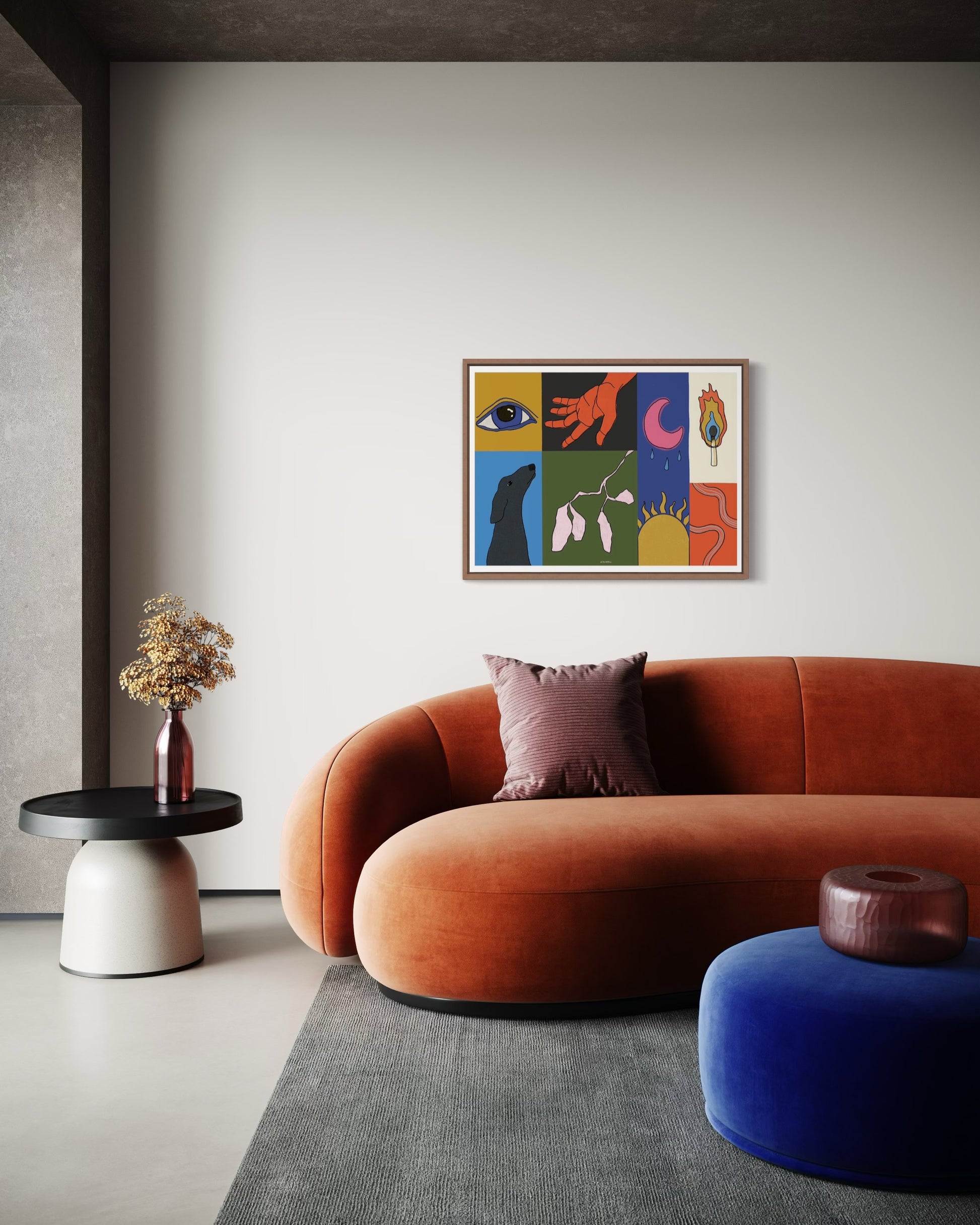 Grafiska illustrationer av olika färgglada motiv i ett collage! Det unika konstverket "Time Will Tell" av den begåvade CALIKARL är ett coolt, meningsfullt föremål som kommer att göra ditt vardagsrum mer elegant.