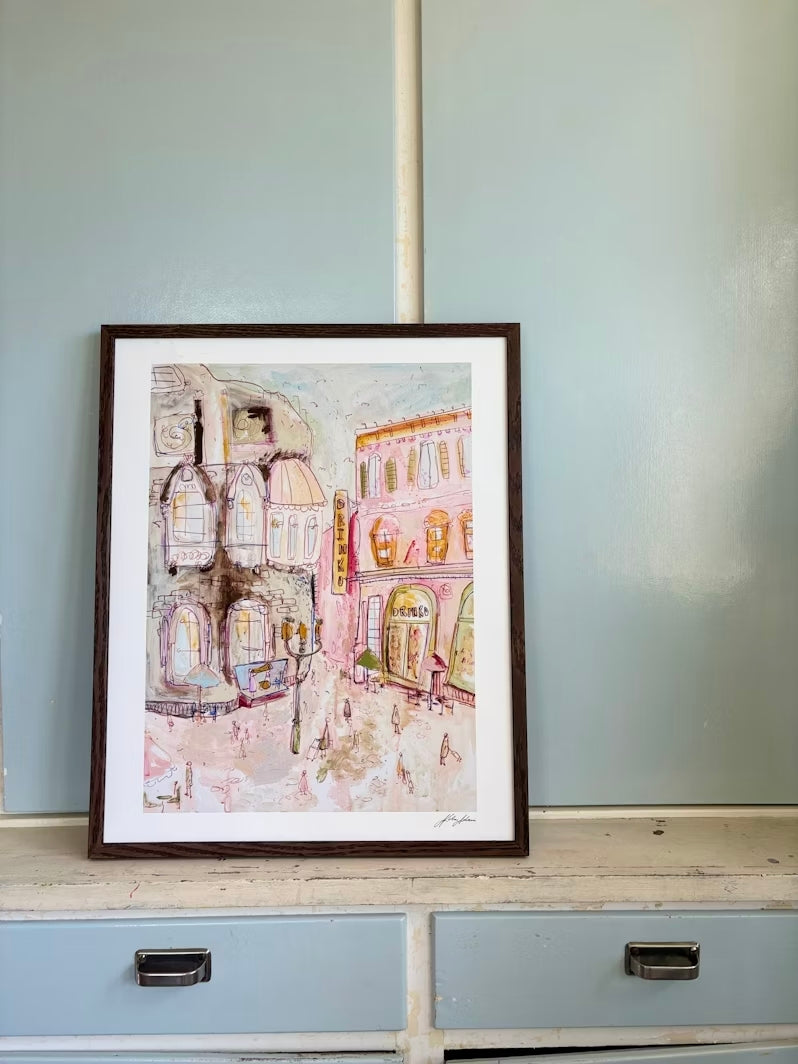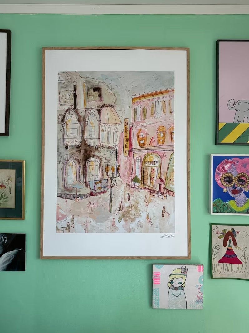 En affisch av duktiga Nike Adawis unika, färgstarka och somriga konstverk "Torget". Detta vackra pastellverk visualiserar en stad och blandar olika tekniker, som till exempel akvarell. Perfekt för det skandinaviska hemmet!