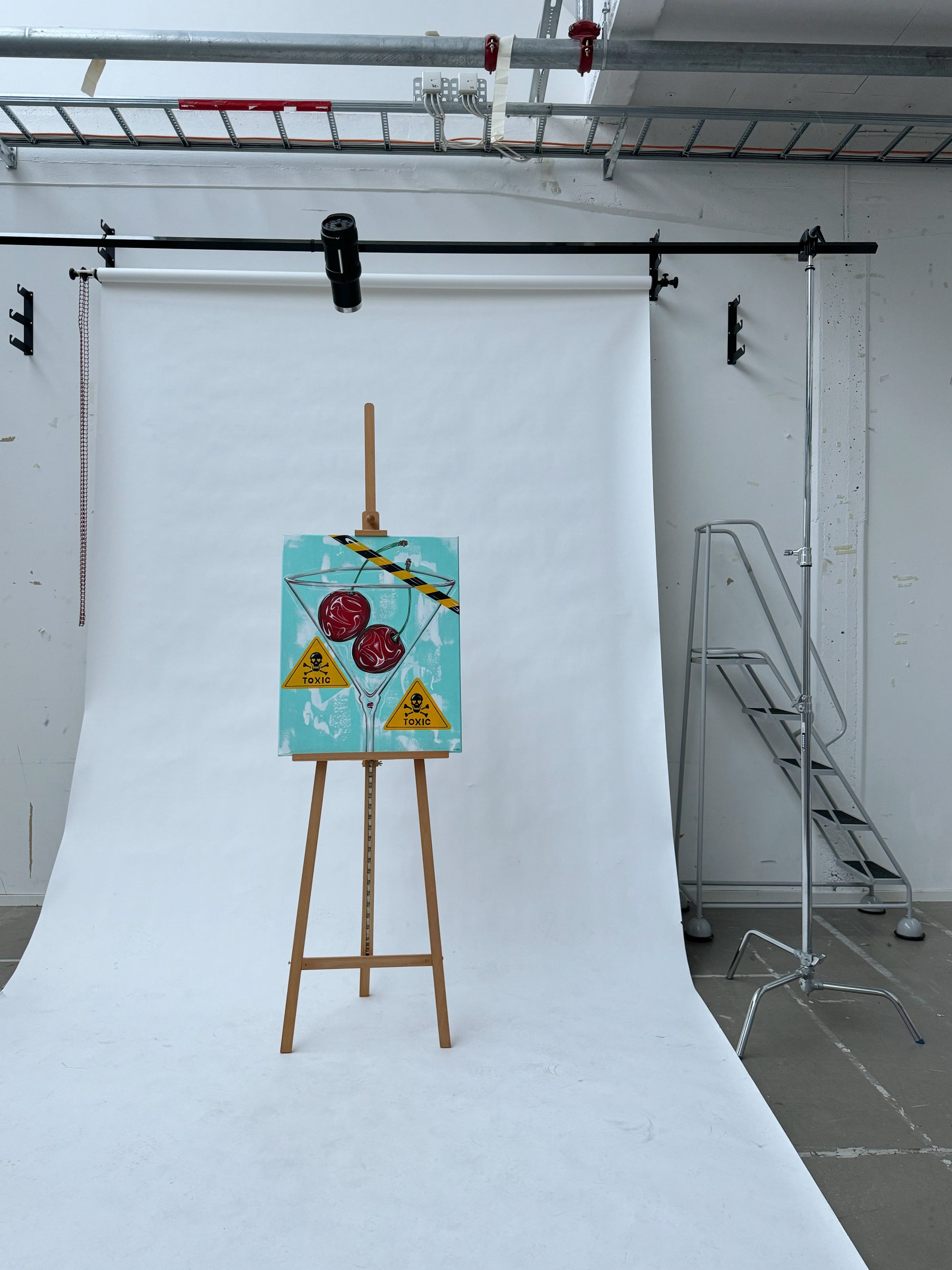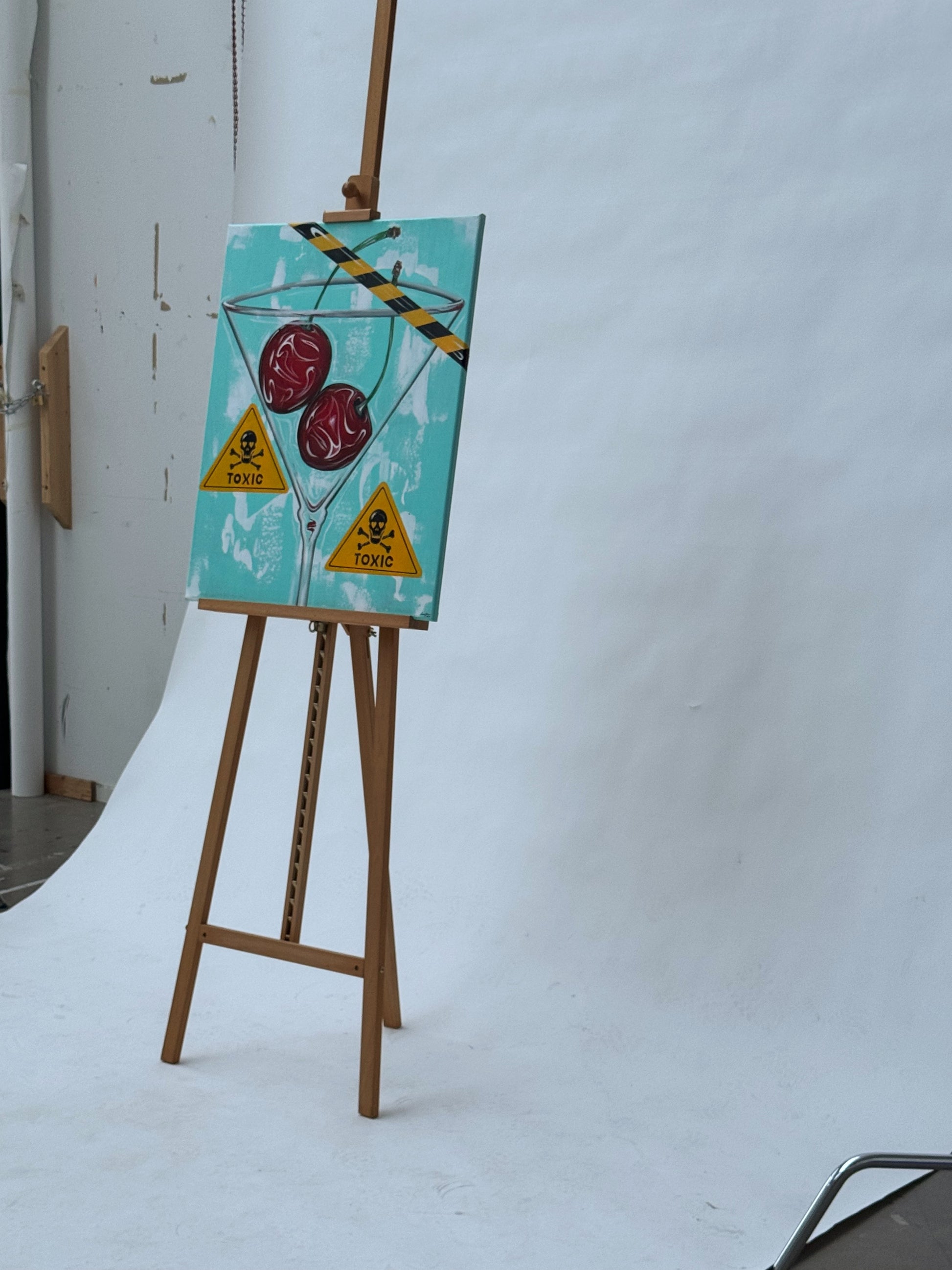 Ett lekfullt och färgsprakande konstverk av glansiga körsbär i martiniglas med varningsskyltar runt, handgjorda av duktiga Lovisa Hellqvist. Denna målning är fantasifull och edgy, och kommer definitivt att ge ditt hem en unik och stilren look!