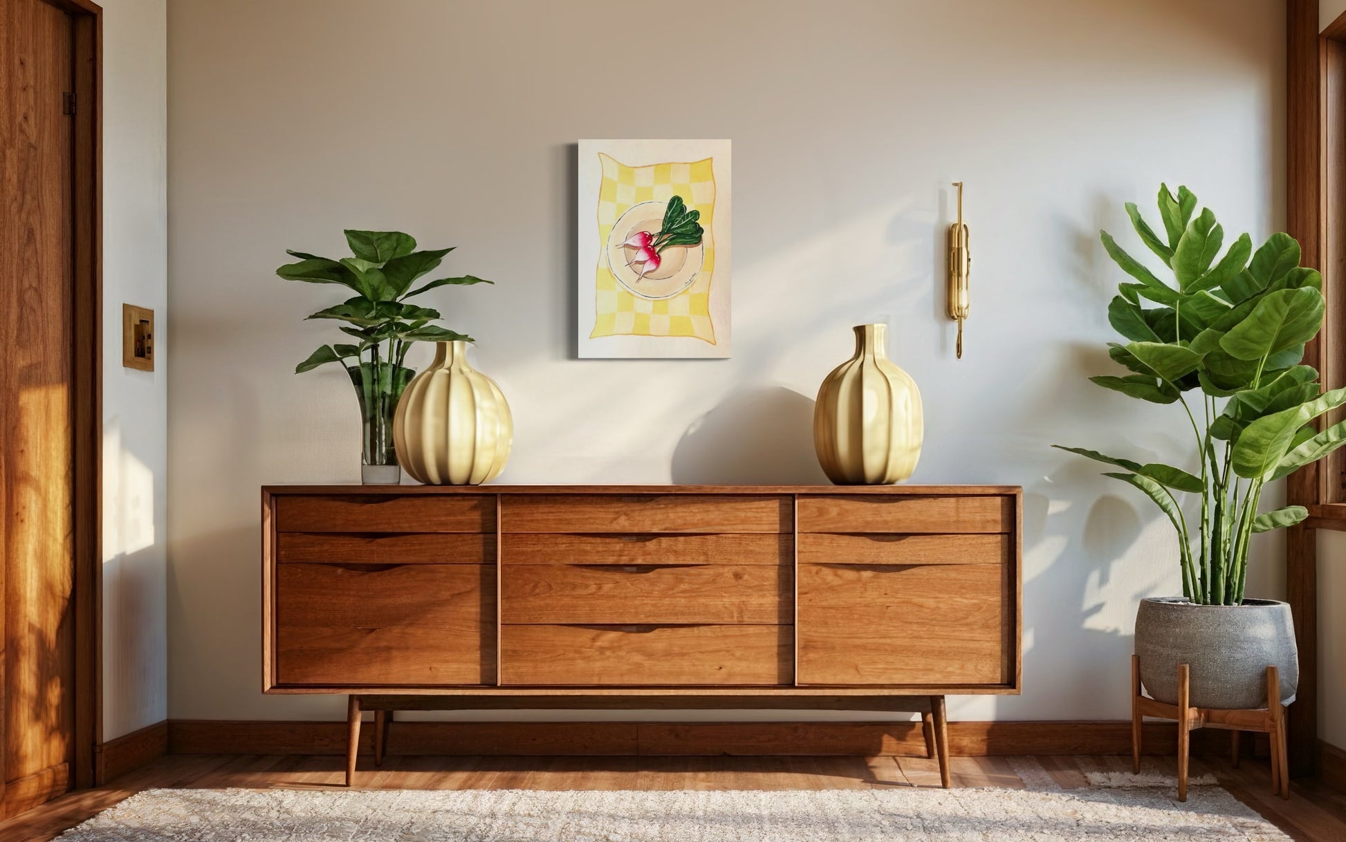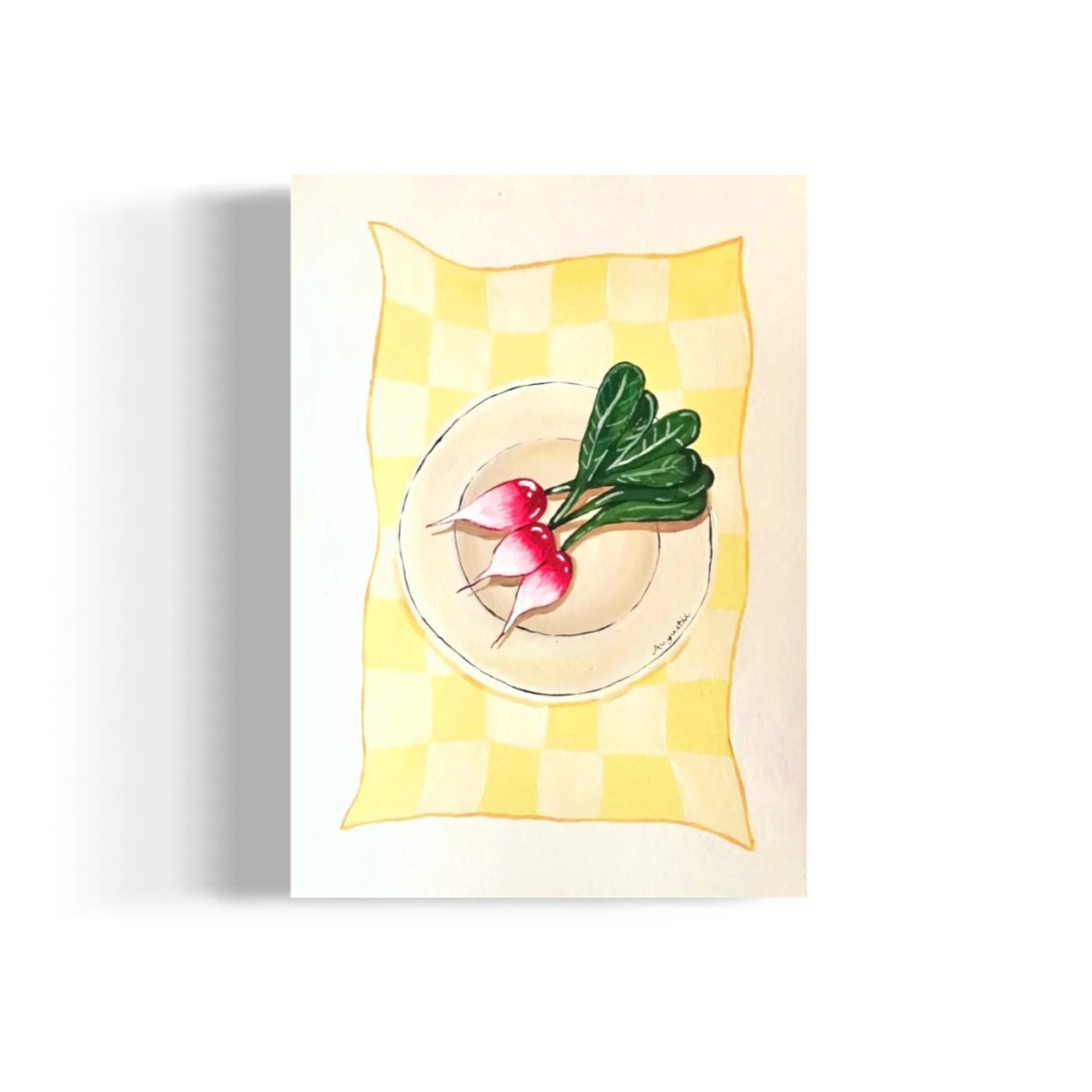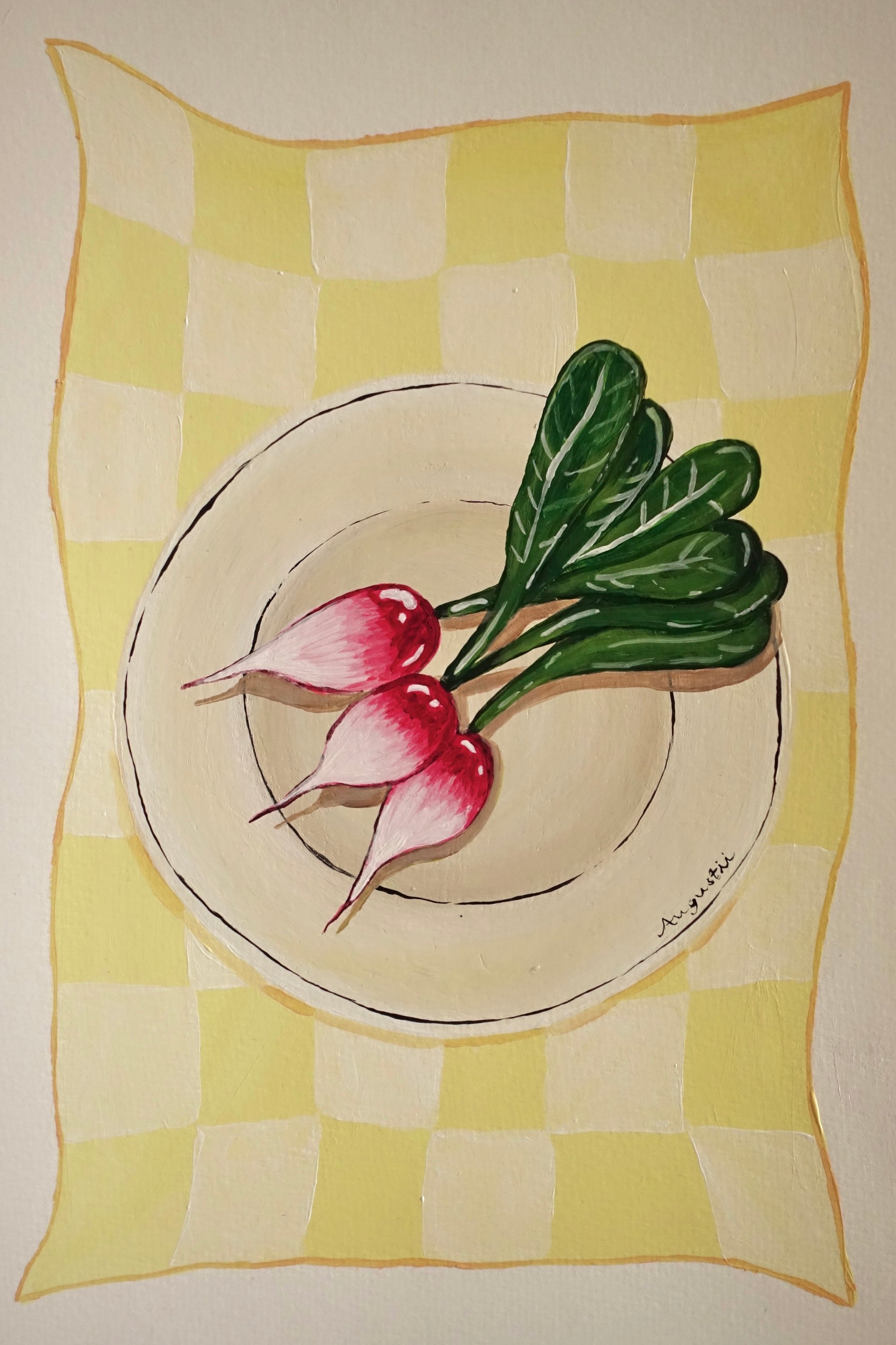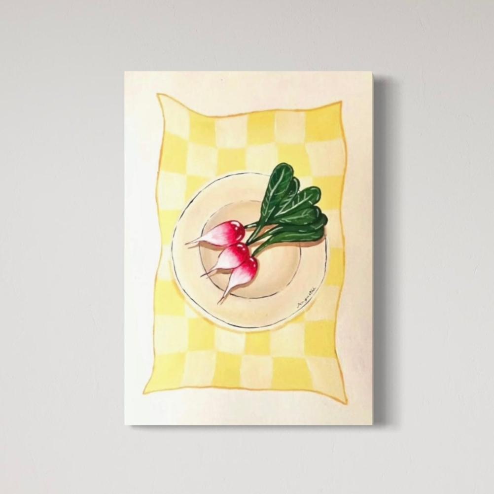 En handgjord, färgglad tavla som ger mer glädje och stil i ditt hem! "Tre Rädisor" av Alice Söderholm är ett unikt konstverk med rädisor på gulrutig bakgrund. Firar de små sakerna i livet!