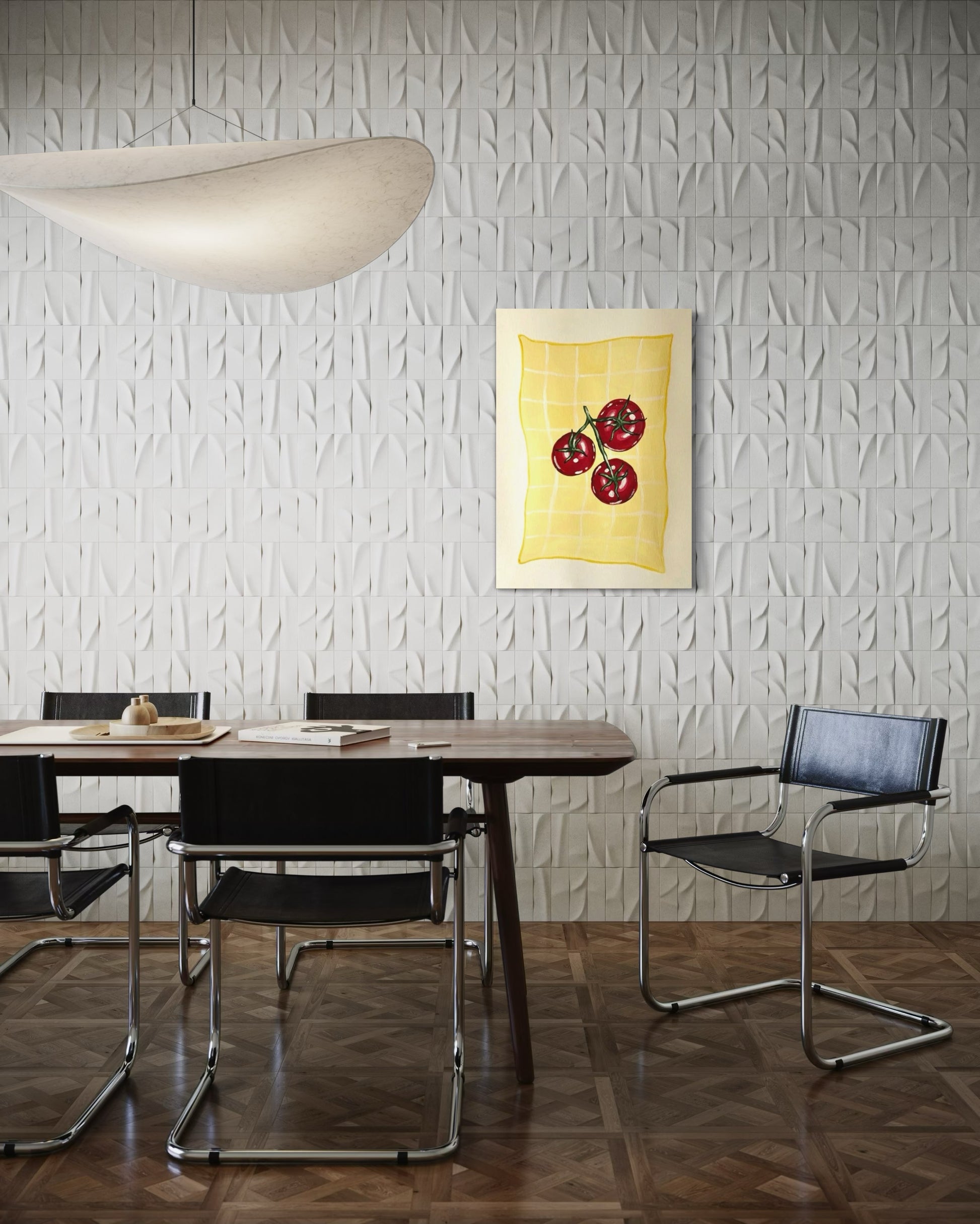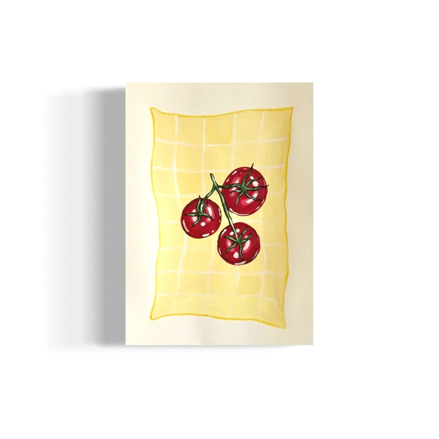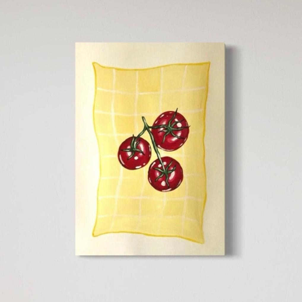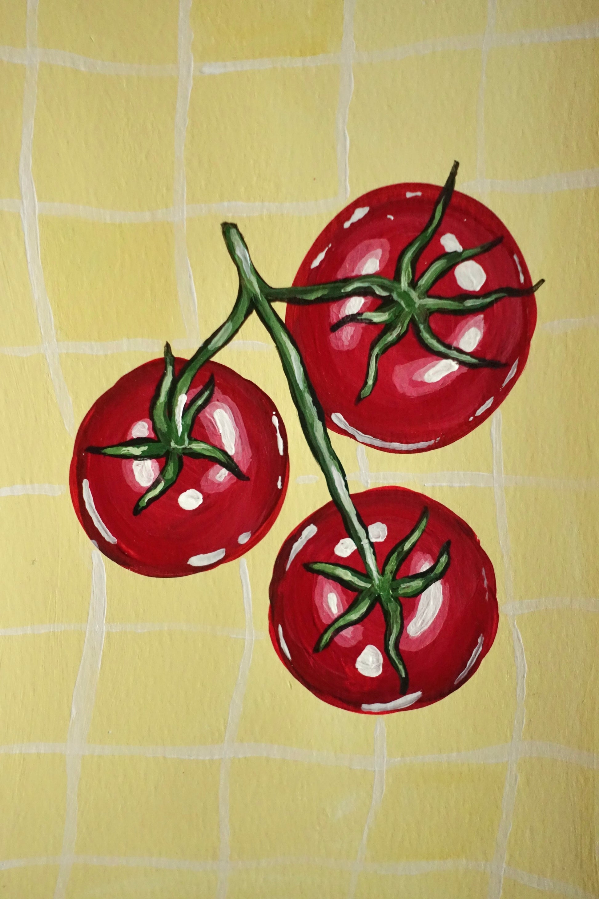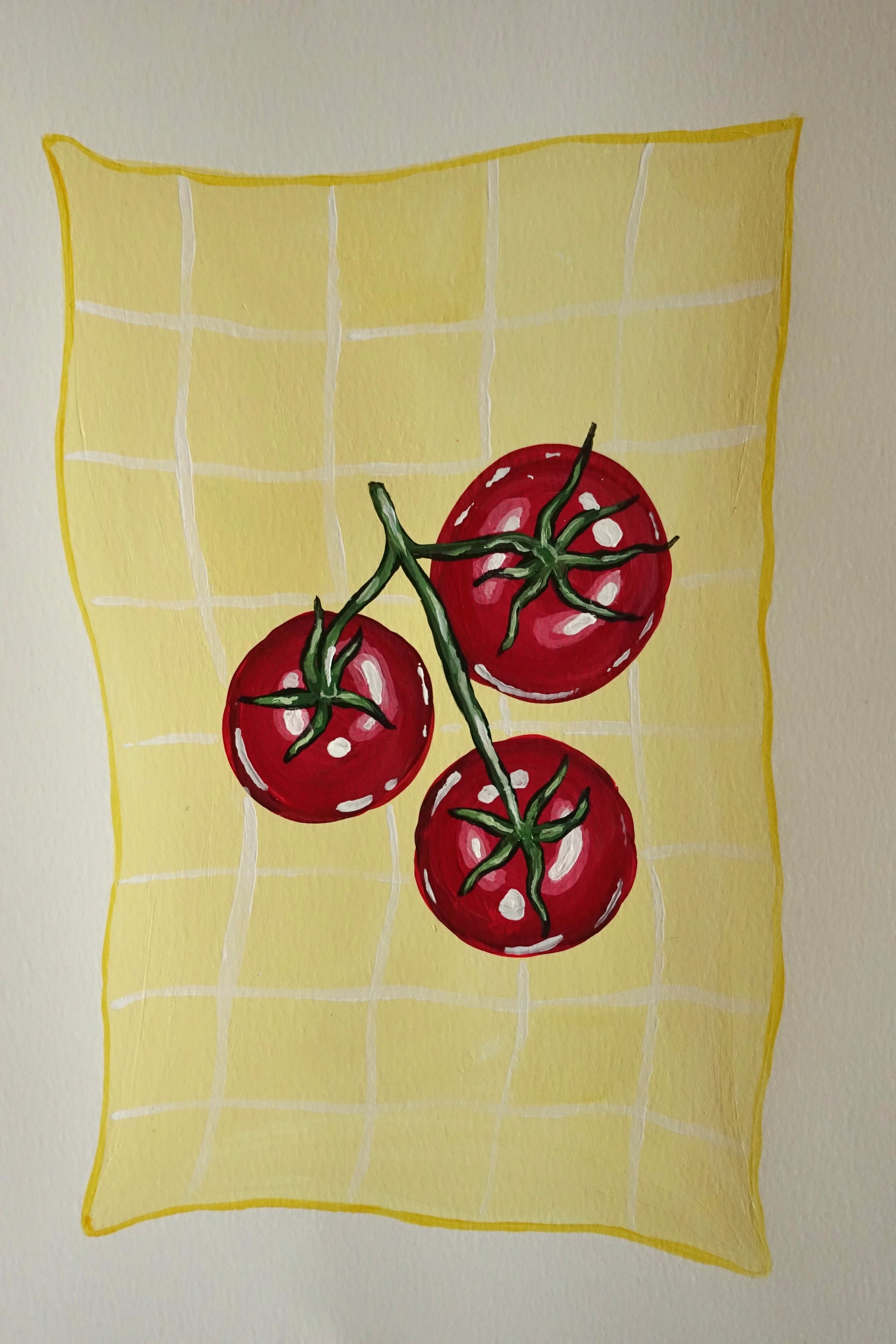 Konstnären Alice Söderholms handgjorda målning "Tre Tomater" visualiserar tre tomater på en gulrutig, vågig botten. Dekorera din vägg med detta vackra, unika konstverk och gör din heminredning mer färgstark och elegant!
