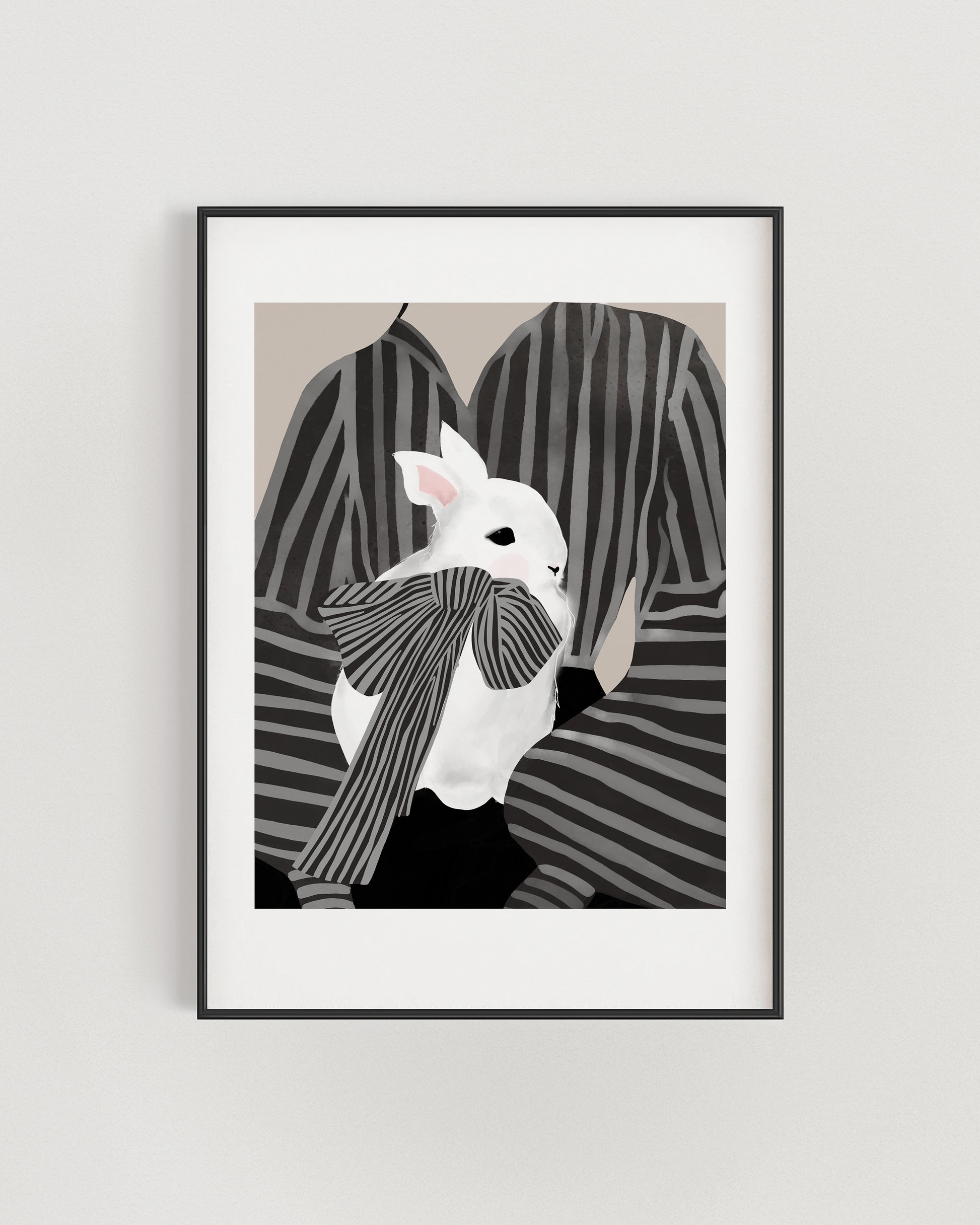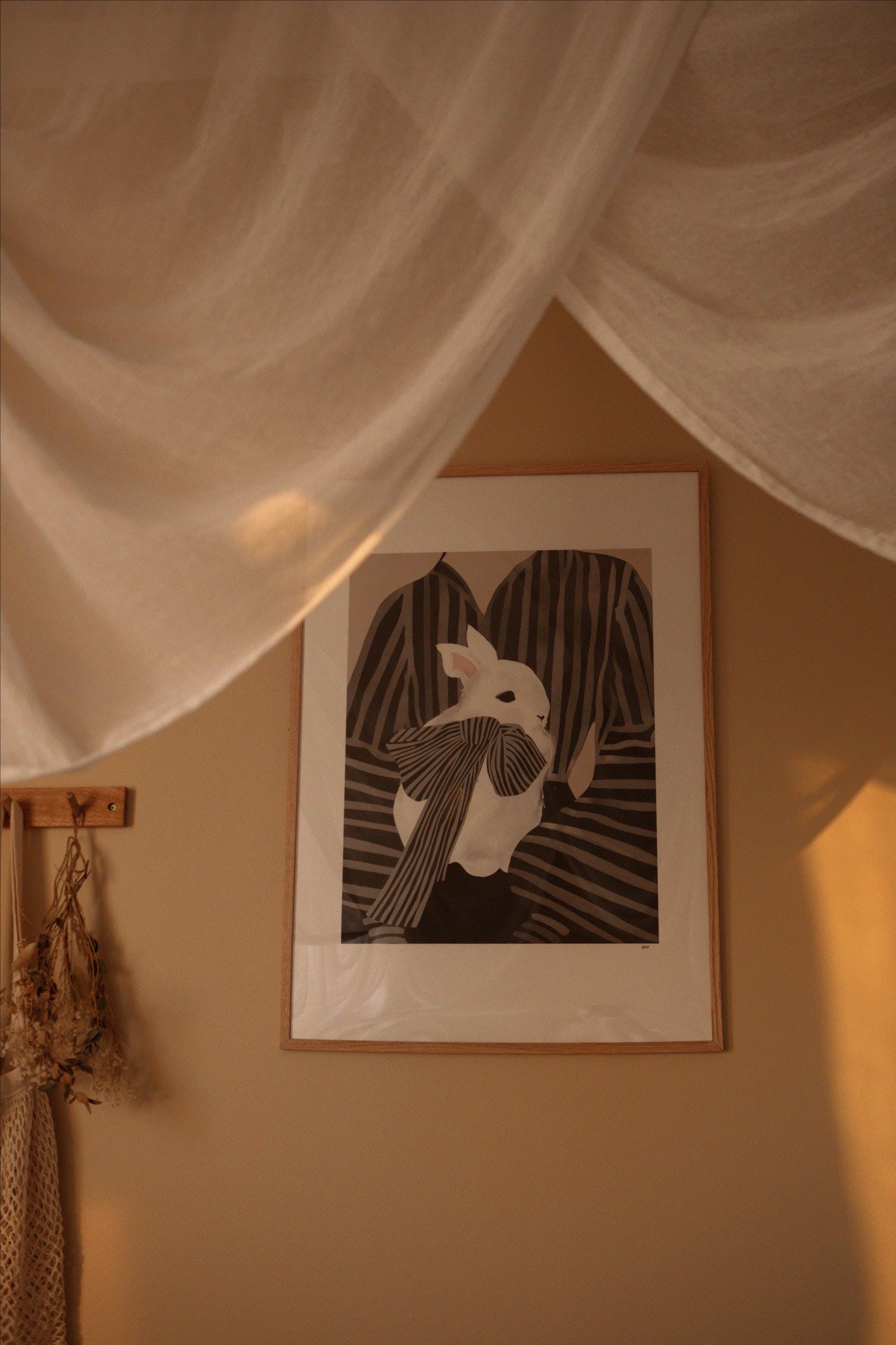 ”Twinning” av Emma Älveus är ett uttrycksfullt svartvitt konstverk med en speglad komposition där en vit kanin står i centrum, omgiven av abstrakta, botaniska former. Den grafiska kontrasten och det lekfulla motivet tillför både karaktär och lugn till moderna eller minimalistiska miljöer.
