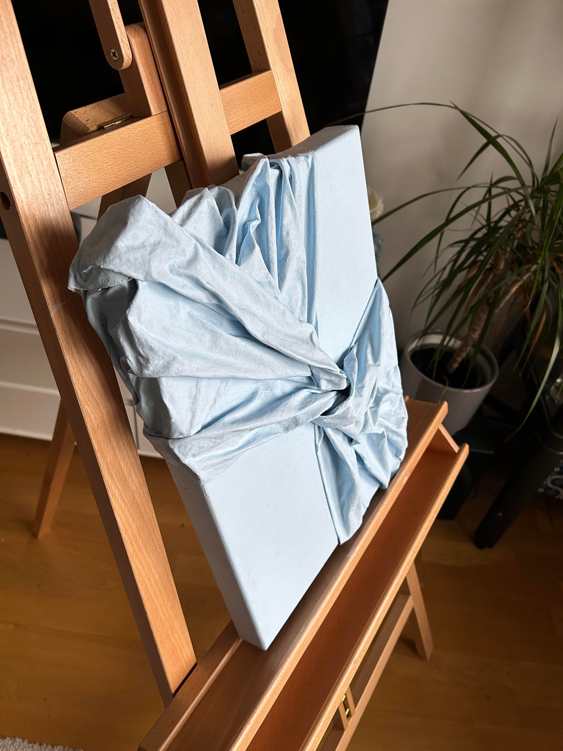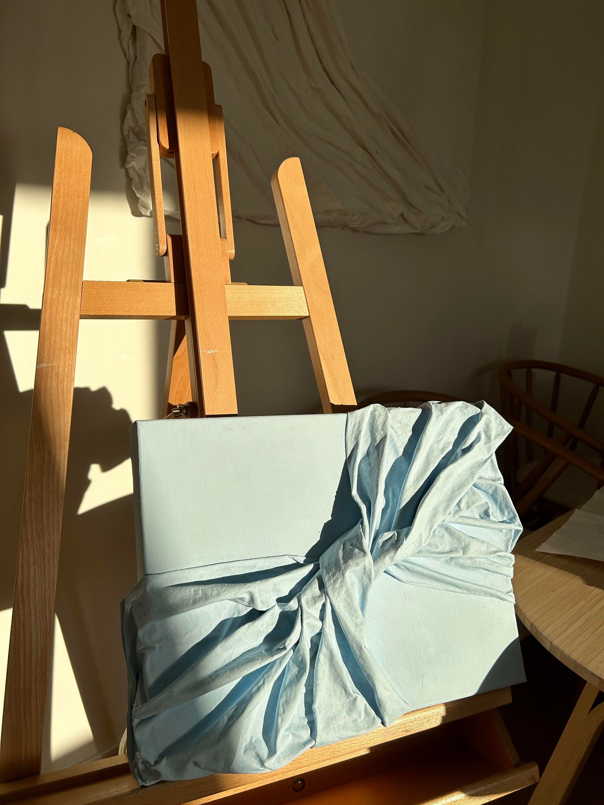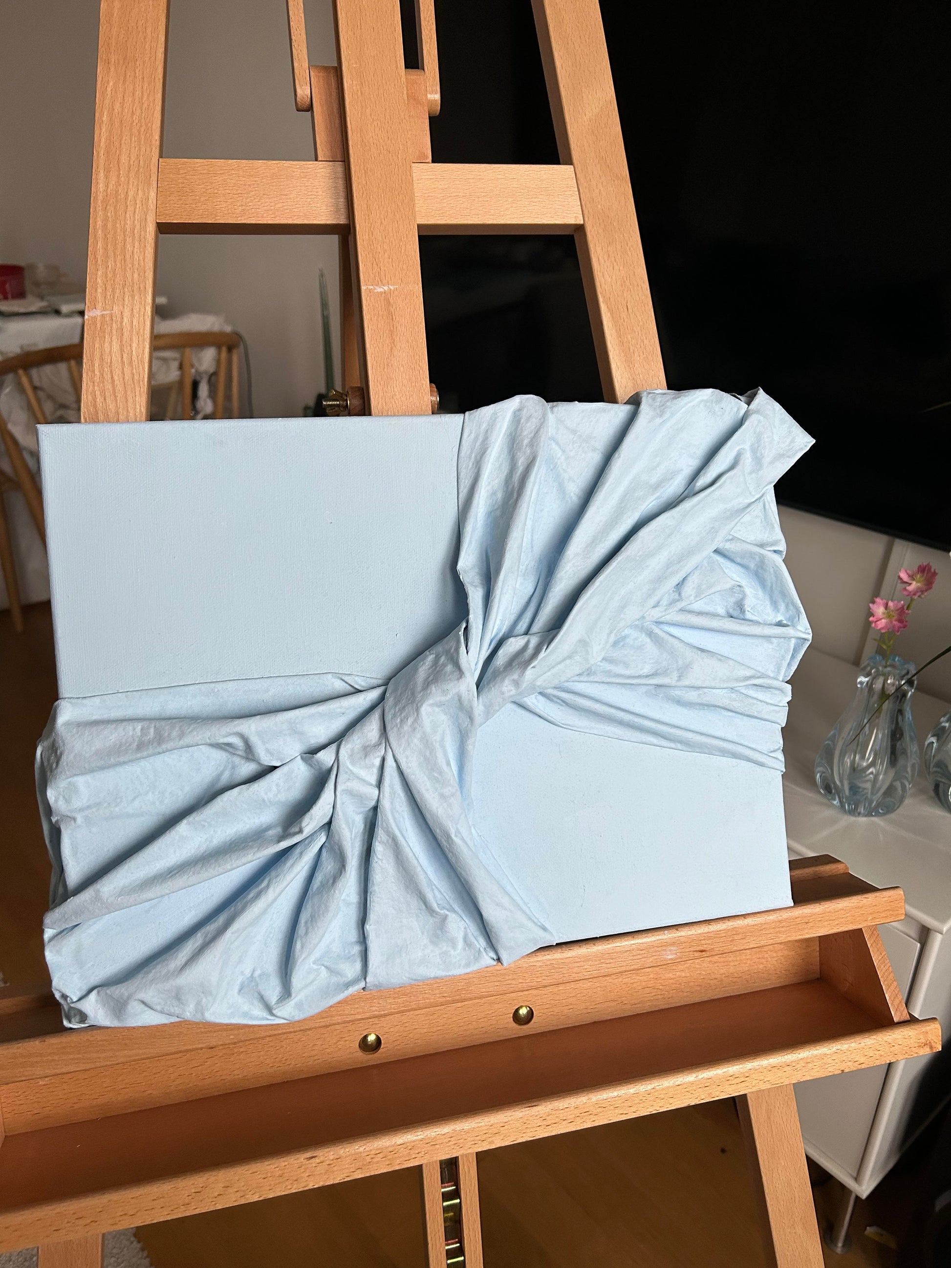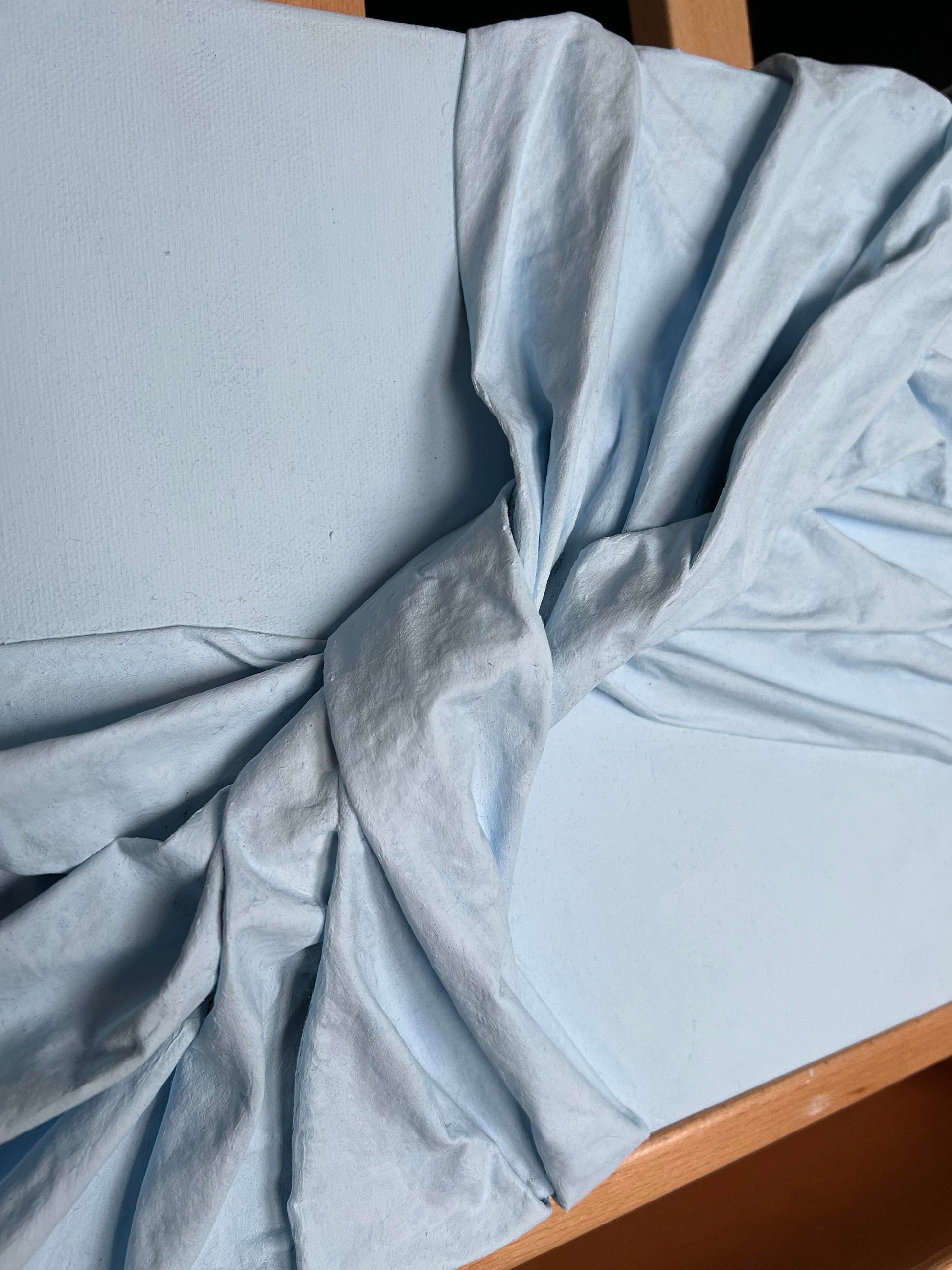 En strukturerad målning skapad av textiltyg, som har målats med akryl. Den har en ljus, livfull blå färg, och tyget är format för att behålla en stel form.