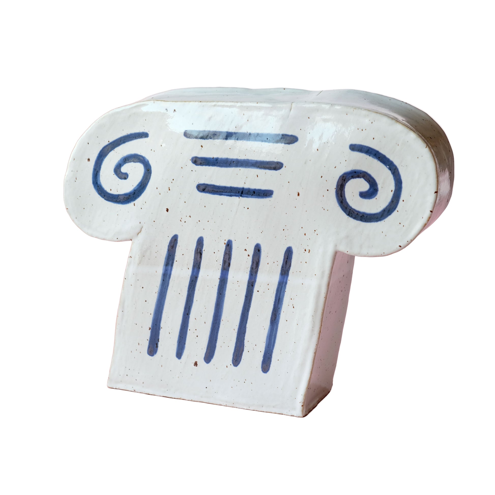 Ett stort kapitäl ur serien KURSIV, där allt lutar lite åt höger. Denna skulptur är byggd av prickig stengods, bemålad med blå dekorfärg och därefter glaserad med blank, vit glasyr. Finns i ett exemplar.