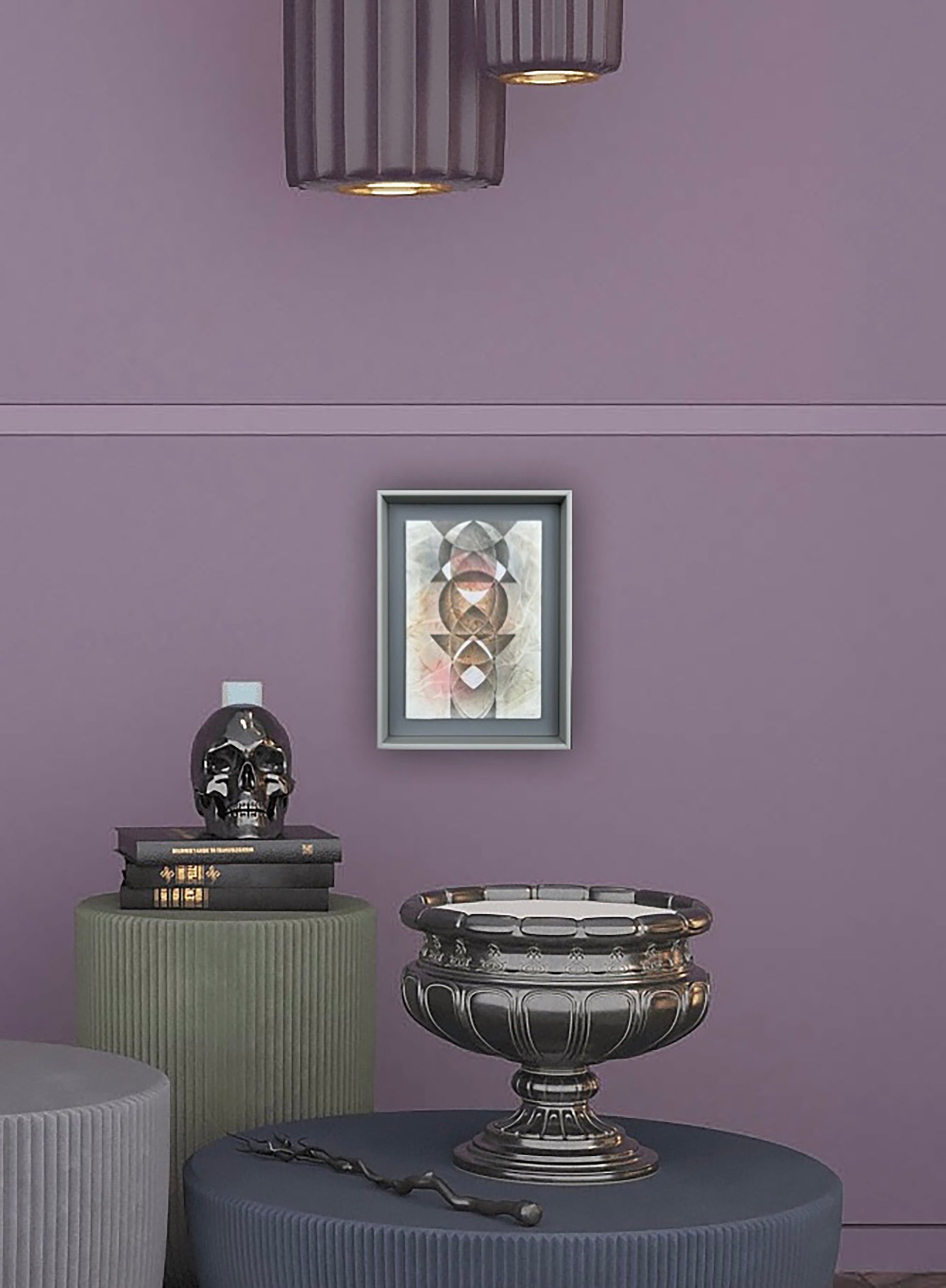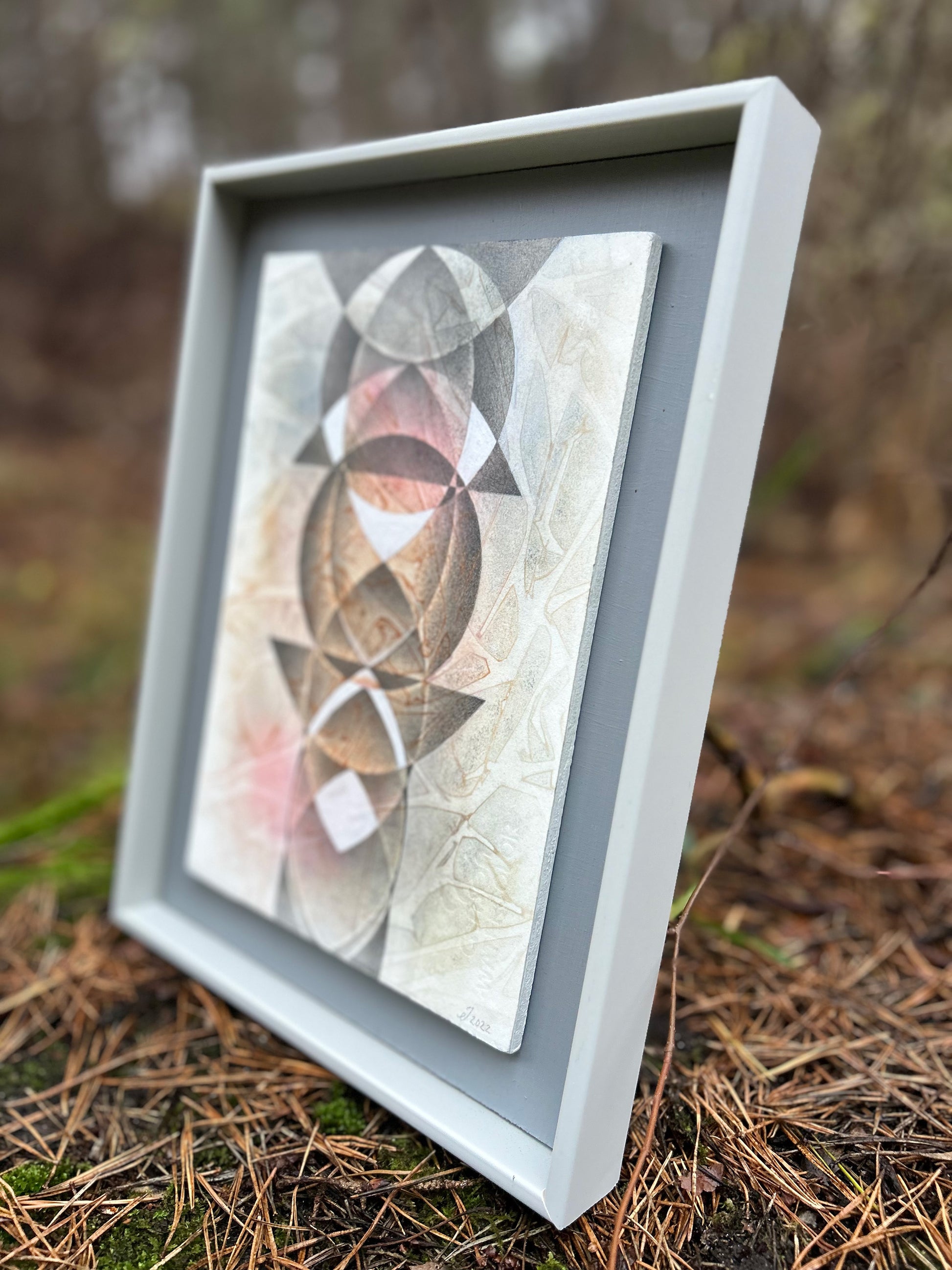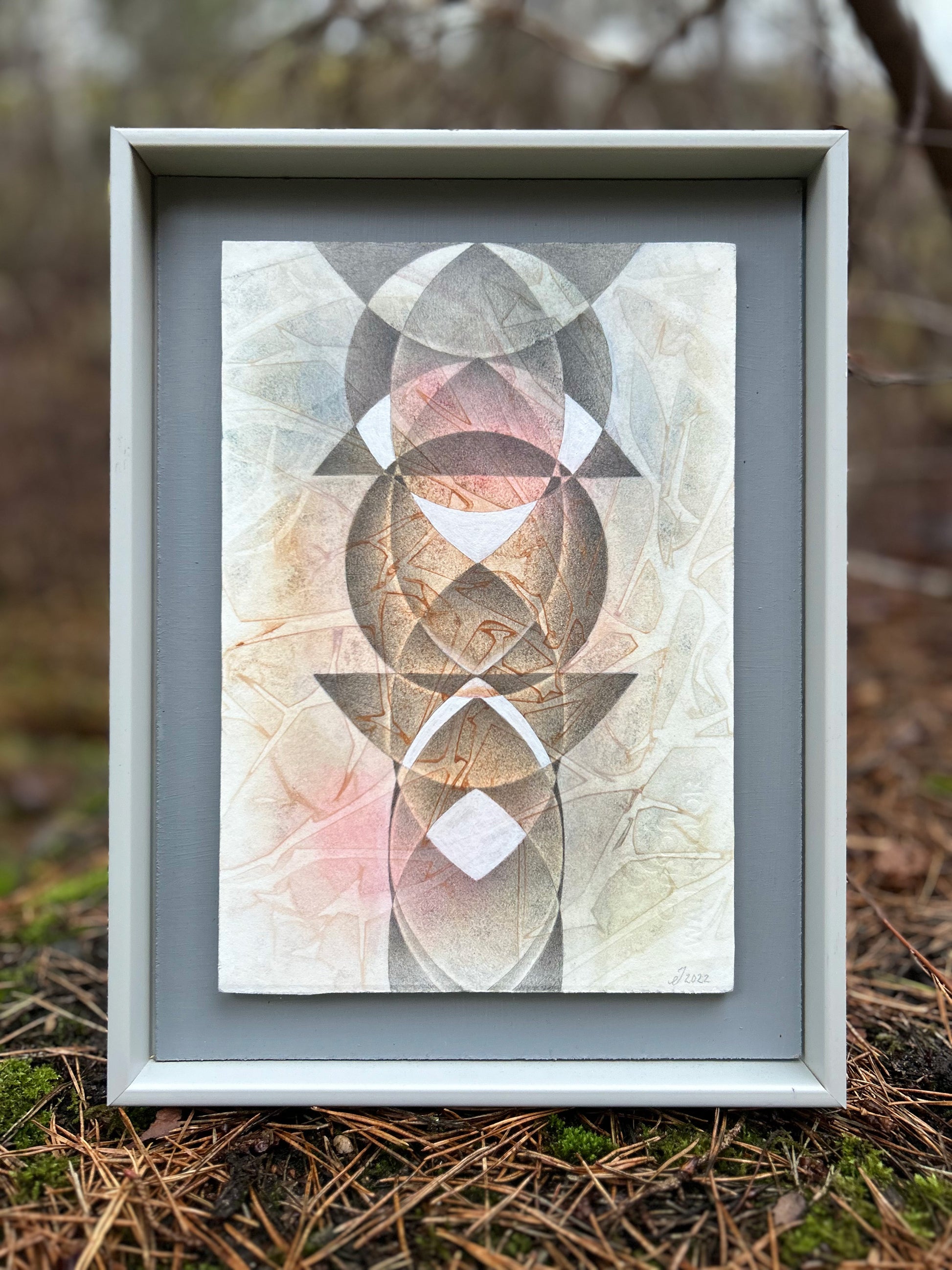 Abstrakt akvarell med överlappande geometriska mönster i en subtil färgpalett som sträcker sig från vitt till grått och rosa. Den strukturerade vertikala kompositionen rör sig som en ljudvåg över papperets yta och blandar mjuka övergångar med distinkta rytmer.