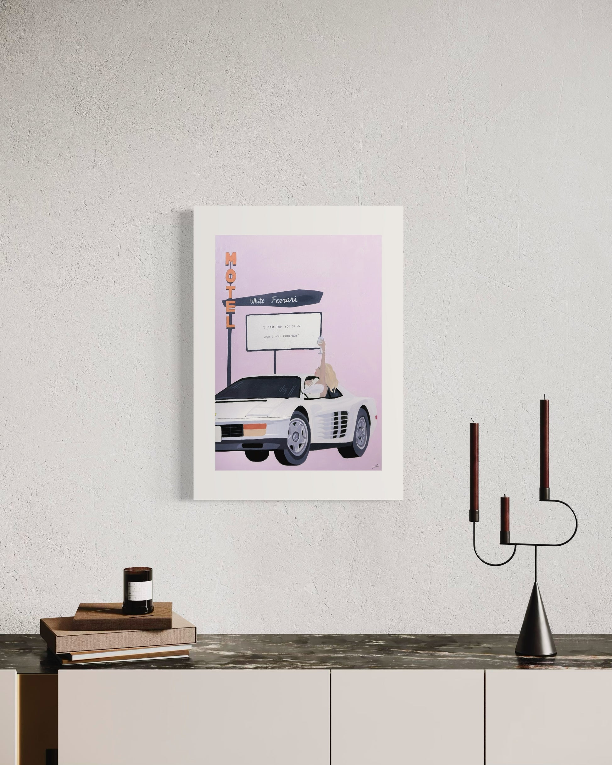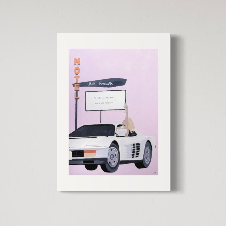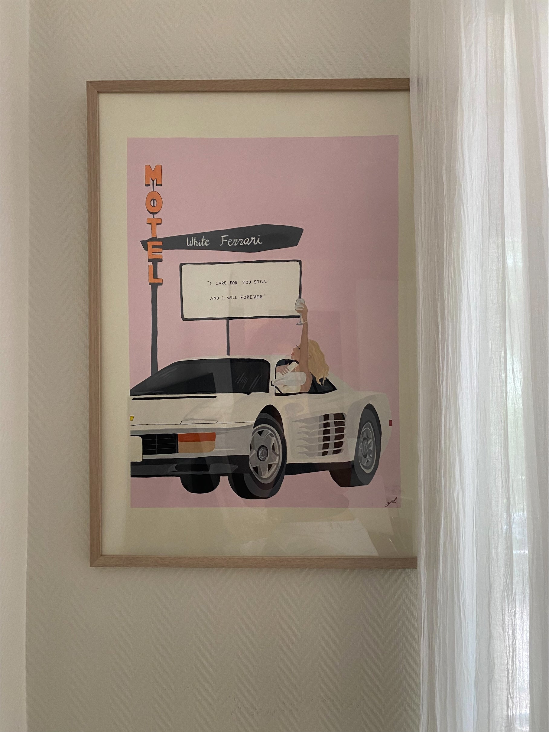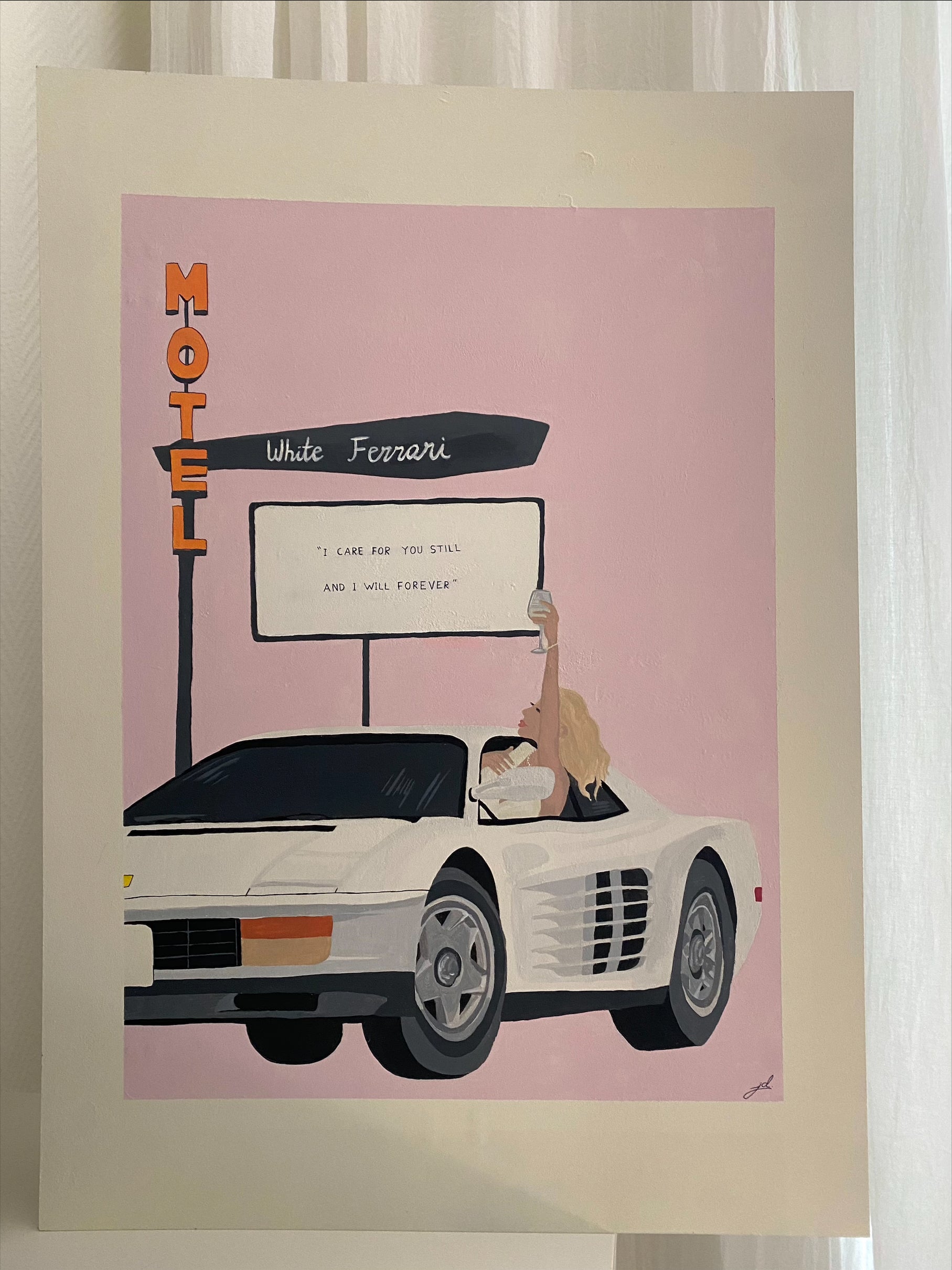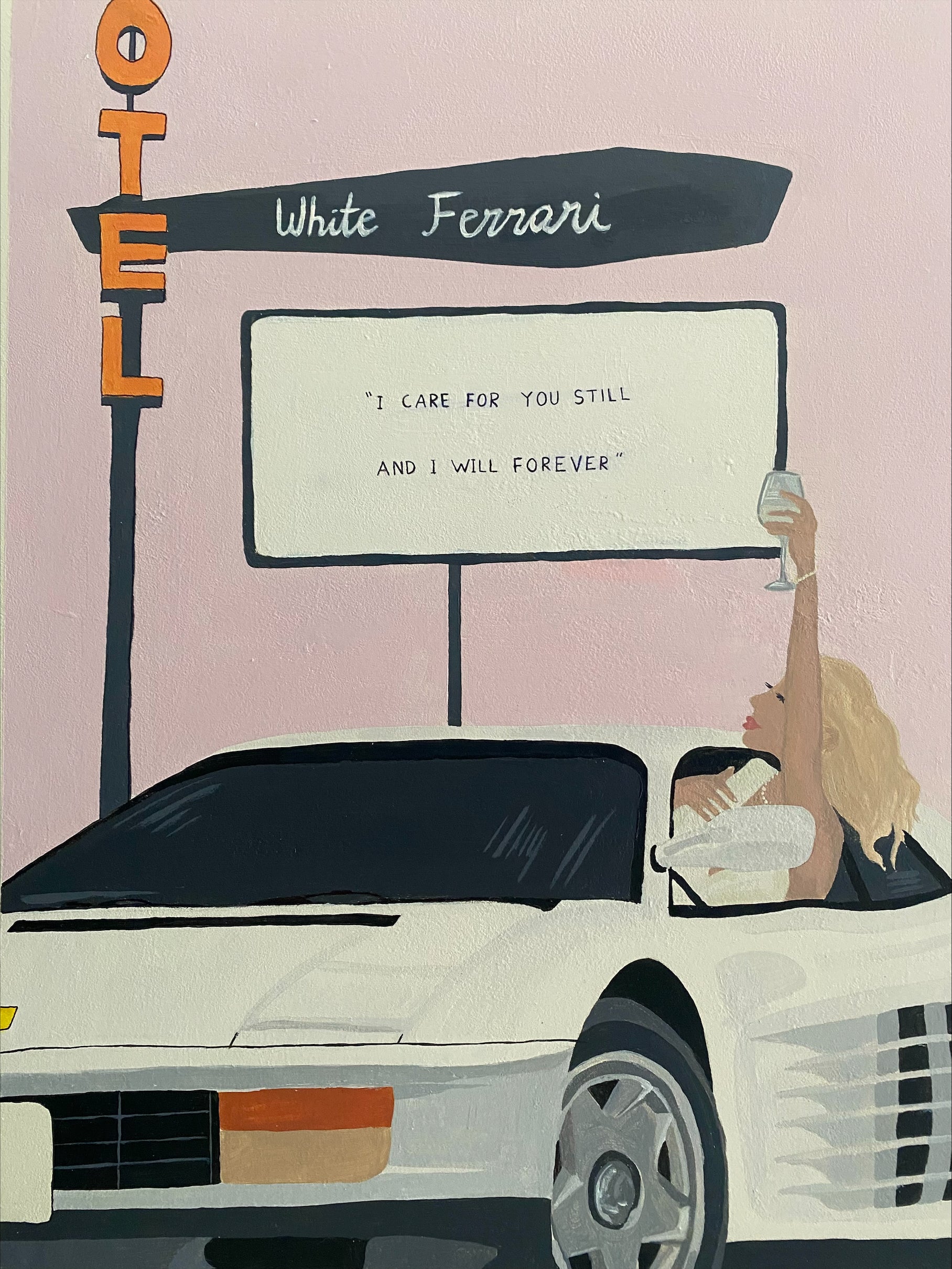 Den ursprungliga handgjorda akrylmålningen "White Ferrari" av konstnären Julia Diep. Ett unikt, färgstarkt konstverk som föreställer en snygg kvinna i en bil. Perfekt för det skandinaviska hemmet!