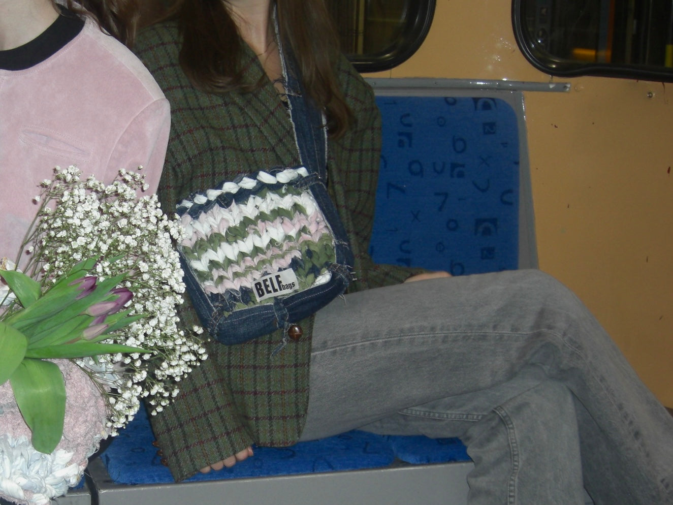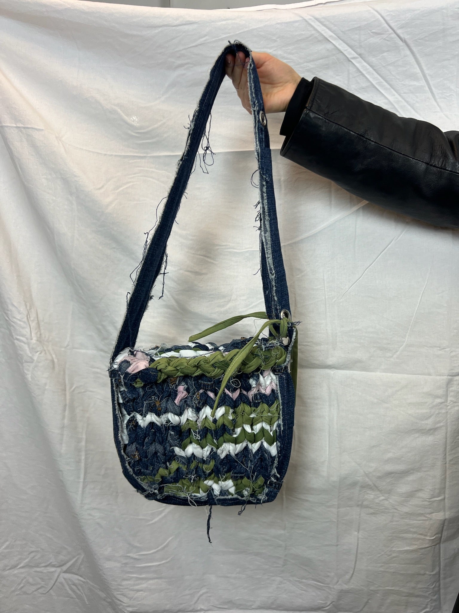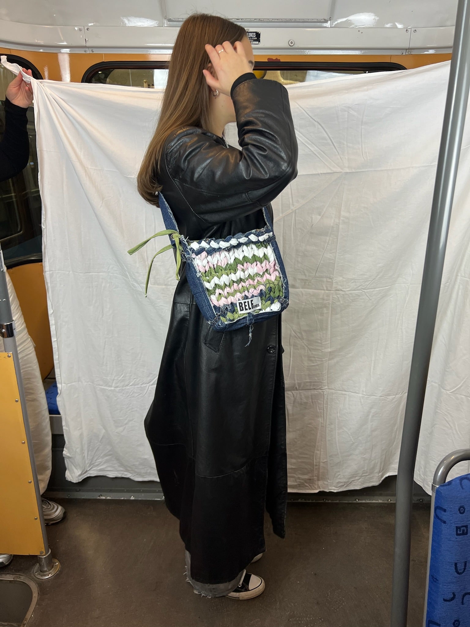 Denna medelstora BELFbag är gjord av denim och twill i blå, vita, gröna och rosa nyanser. Handgjord av BELFbag-teamet. Väskan har en justerbar rem som gör väskan både till en shouldbag och crossover-väska. Väskan kommer att formas av sin bärare och förändras naturligt med tiden.