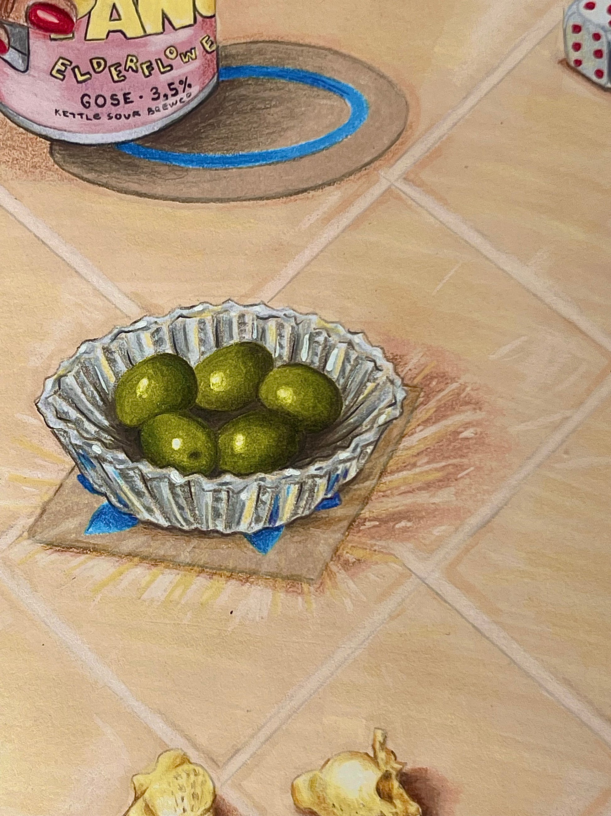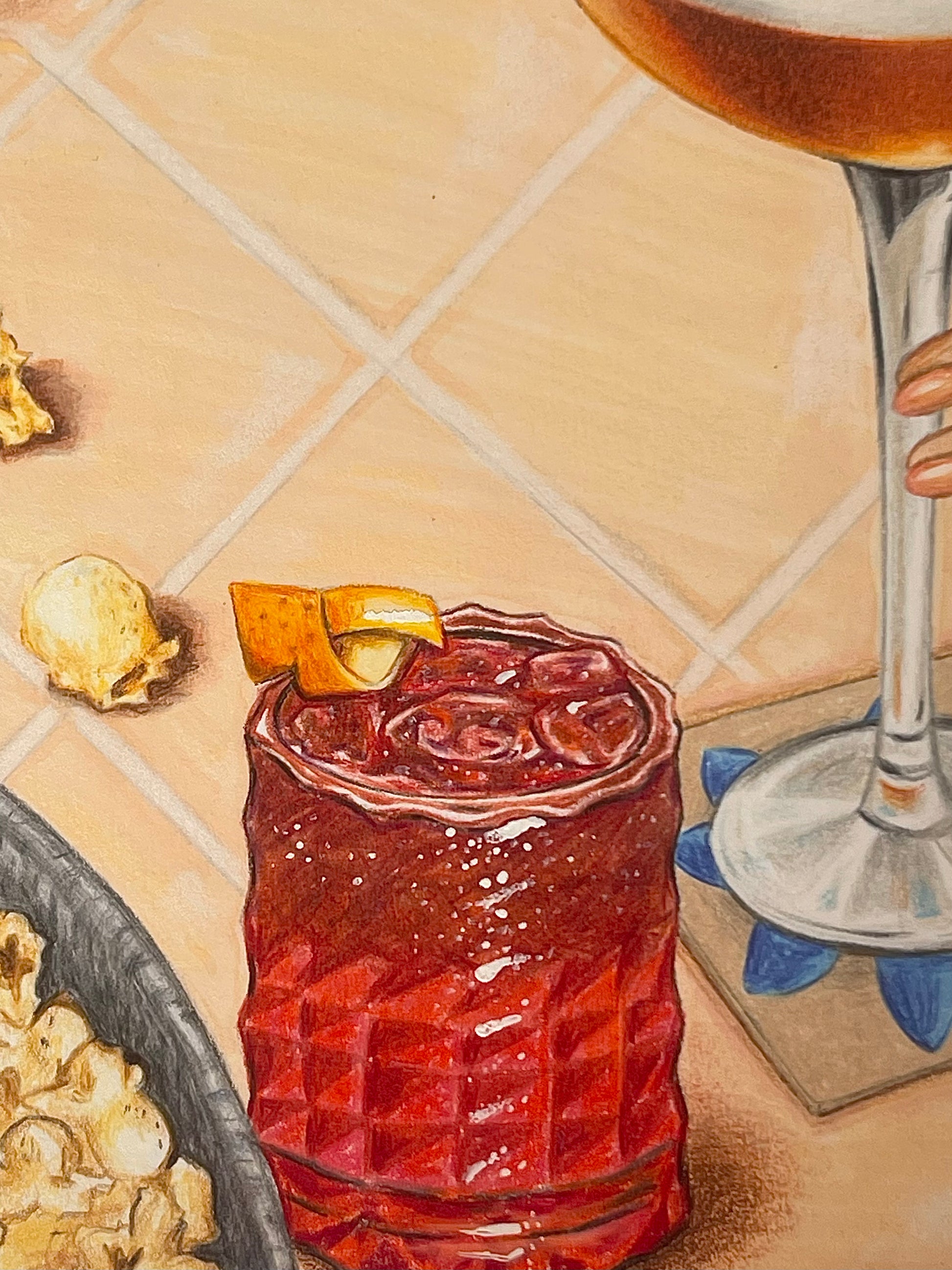 Detta är en affisch av det handgjorda konstverket "STRAIGHT UP" skapat av konstnären Sara Blomberg. Föreställ dig ett bord med några drinkar, snacks och spel – det kommer att bli ett roligt och lekfullt tillskott på vilken vägg som helst!